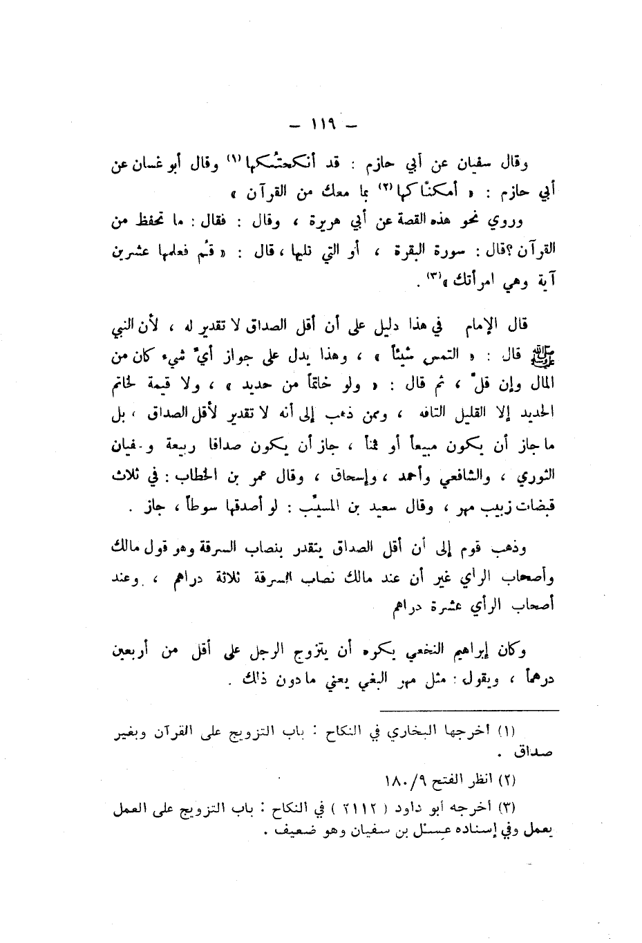 قَالَ الإِمَامُ: فِي هَذَا دَلِيل على أَن أقل الصَدَاق لَا تَقْدِير لَهُ، لِأَن النَّبِيّ صَلَّى اللهُ عَلَيْهِ وَسَلَّمَ، قَالَ: «التمس شَيْئا»، وَهَذَا يدل على جَوَاز أيِّ شَيْء كَانَ من المَال، وَإِن قلَّ، ثُمَّ قَالَ: «وَلَو خَاتمًا من حَدِيد»، وَلَا قيمَة لخاتم الْحَدِيد إِلا الْقَلِيل التافه، وَمِمَّنْ ذهب إِلَى أَنَّهُ لَا تَقْدِير لأَقل الصَدَاق، بل مَا جَازَ أَن يكون مَبِيعًا، أَو ثمنا، جَازَ أَن يكون صَدَاقا ربيعَة، وَسُفْيَان الثَّوْرِيّ، وَالشَّافِعِيّ، وَأَحْمَد، وَإِسْحَاق، وَقَالَ عُمَر بْن الْخَطَّاب، فِي ثَلَاث قبضات زبيب مهر، وَقَالَ سَعِيد بْن الْمُسَيِّب: لَو أصدقهَا سَوْطًا، جَازَ.