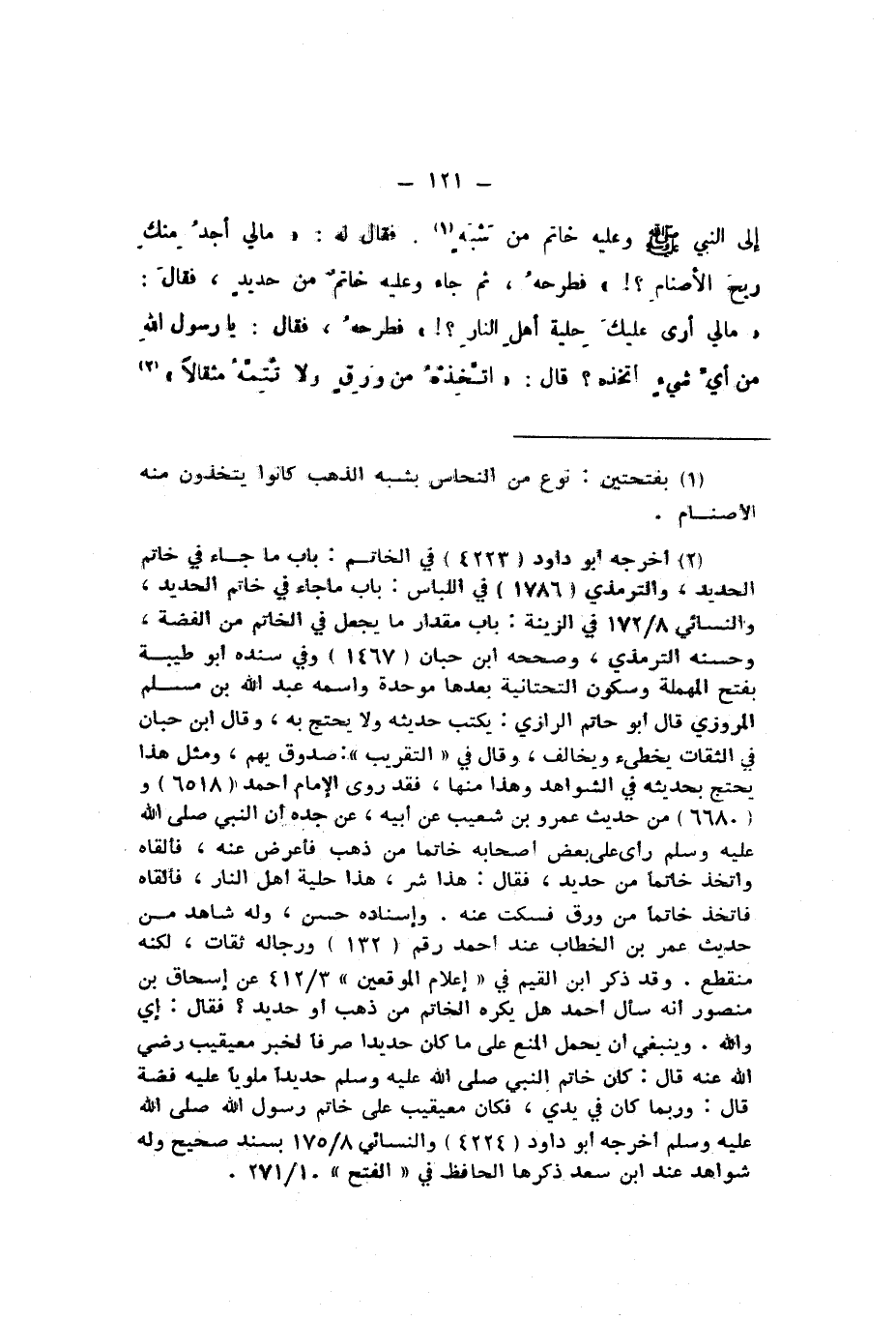 فَقَالَ لَهُ: «مَا لِي أَجِدُ مِنْكَ رِيحَ الأَصْنَامِ؟!» فَطَرَحَهُ، ثُمَّ جَاءَ وَعَلَيْهِ خَاتَمٌ مِنْ حَدِيدٍ، فَقَالَ: «مَا لِي أَرَى عَلَيْكَ حِلْيَةَ أَهْلِ النَّارِ؟!» فَطَرَحَهُ، فَقَالَ يَا رَسُولَ اللَّهِ، مِنْ أَيِّ شَيْءٍ أتَّخِذُهُ؟، قَالَ: «اتَّخِذْهُ مِنْ وَرِقٍ وَلا تُتِمَّهُ مِثْقَالا».
