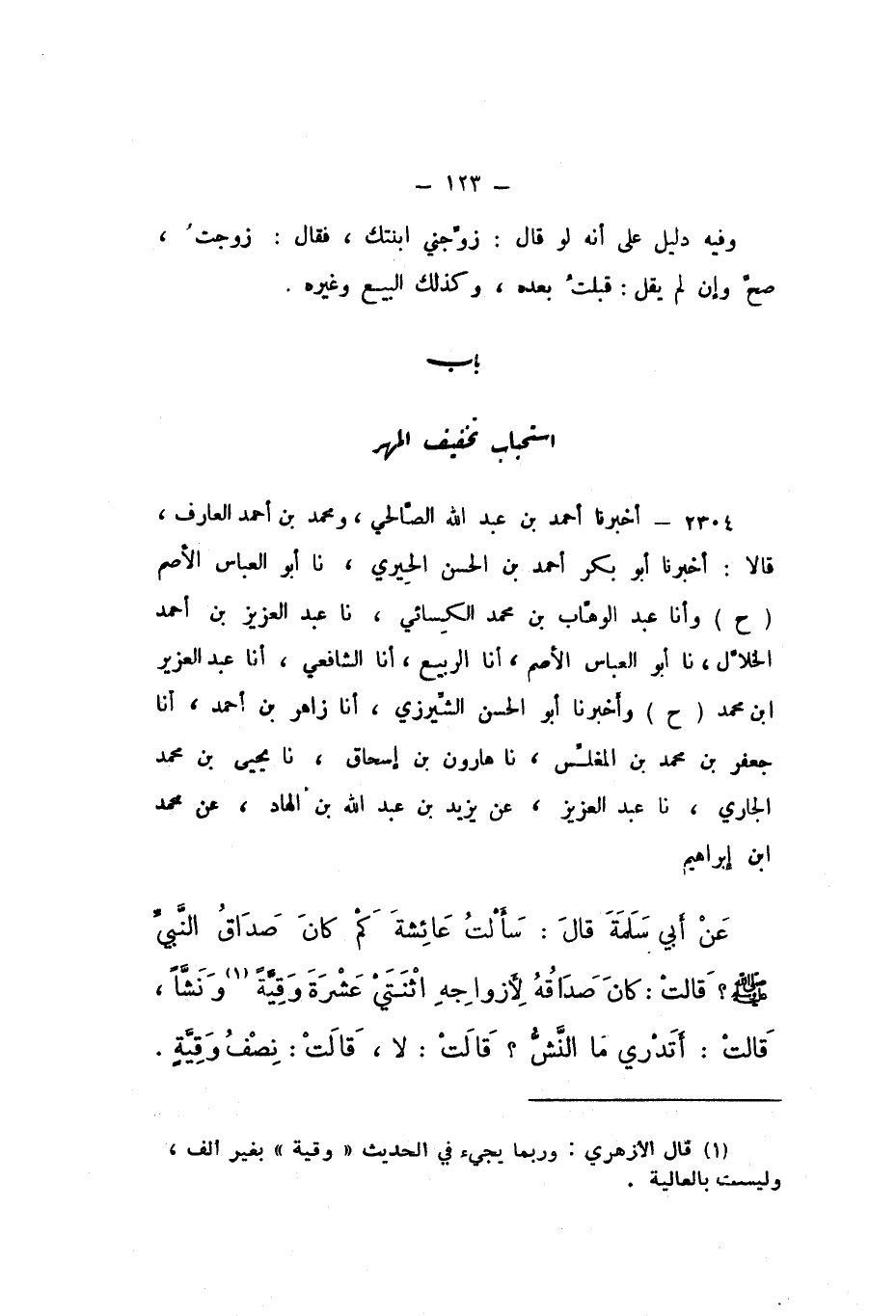 ح وَأَخْبَرَنَا أَبُو الْحَسَنِ الشِّيرَزِيُّ، أَنا زَاهِرُ بْنُ أَحْمَدَ، أَنا جَعْفَرُ بْنُ مُحَمَّدِ بْنِ الْمُغَلِّسِ، نَا هَارُونُ بْنُ إِسْحَاقَ، نَا يَحْيَى بْنُ مُحَمَّدٍ الْجَارِي، نَا عَبْدُ الْعَزِيزِ، عَنْ يَزِيدَ بْنِ عَبْدِ اللَّهِ بْنِ الْهَادِ، عَنْ مُحَمَّدِ بْنِ إِبْرَاهِيمَ، عَنْ أَبِي سَلَمَةَ، قَالَ: سَأَلْتُ عَائِشَة: كَمْ كَانَ صَدَاقُ النَّبِيُّ صَلَّى اللهُ عَلَيْهِ وَسَلَّمَ؟، قَالَتْ: كَانَ صَدَاقُهُ لأَزْوَاجِهِ اثْنَتَيْ عَشْرَةَ وَقِيَّةً وَنَشًّا، قَالَتْ: أَتَدْرِي مَا النَّشُّ؟ قَالَ: لَا، قَالَتْ: نِصْفُ وَقِيَّةٍ ".