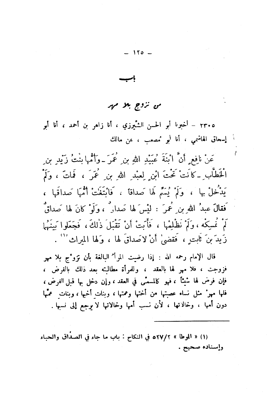 2304 - أَخْبَرَنَا أَبُو الْحَسَنِ الشِّيرَزِيُّ، أَنا زَاهِرُ بْنُ أَحْمَدَ، أَنا أَبُو إِسْحَاقَ الْهَاشِمِيُّ، أَنا أَبُو مُصْعَبٍ، عَنْ مَالِكٍ، عَنْ نَافِعٍ، أَنَّ ابْنَةَ عُبَيْدُ اللَّهِ بْنُ عُمَرَ، وَأُمُّهَا بِنْتُ زَيْدِ بْنِ الْخَطَّابِ كَانَتْ تَحْتَ ابْنٍ لِعَبْدِ اللَّهِ بْنِ عُمَرَ، فَمَاتَ، وَلَمْ يَدْخُلْ بِهَا، وَلَمْ يُسَمِّ لَهَا صَدَاقًا، فَابْتَغَتْ أُمُّهَا صَداقَهَا، فَقَالَ عَبْدُ اللَّهِ بْنُ عُمَرَ: «لَيْسَ لَهَا صَدَاقٌ، وَلَوْ كَانَ لَهَا صَدَاقٌ لَمْ نُمْسِكْهُ، وَلَمْ نَظْلِمْهَا، فَأَبَتْ أَنْ تَقْبَلَ ذَلِكَ، فَجَعَلُوا بَيْنَهُمَا زَيْدُ بْنُ ثَابِتٍ، فَقَضَى أَنْ لَا صَدَاقَ لَهَا، وَلَهَا الْمِيرَاثُ»