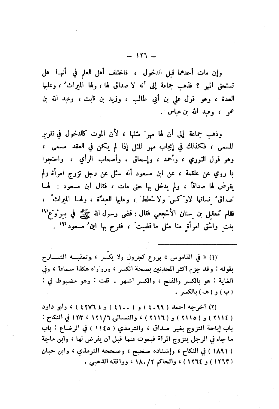 وَذهب جمَاعَة إِلَى أَن لَهَا مهرَ مثلهَا، لِأَن الْمَوْت كالدخول فِي تَقْرِير الْمُسَمّى، فَكَذَلِك فِي إِيجَاب مهر الْمثل إِذا لم يكن فِي العقد مُسَمّى، وَهُوَ قَول الثَّوْرِيّ، وَأَحْمَد، وَإِسْحَاق، وَأَصْحَاب الرَّأْي، وَاحْتَجُّوا بِمَا رُوِيَ عَنْ عَلْقَمَة، عَنِ ابْن مَسْعُود، أَنَّهُ سُئِلَ عَنْ رجل تزوج امْرَأَة وَلم يفْرض لَهَا صَدَاقا، وَلم يدْخل بهَا حَتَّى مَاتَ، فَقَالَ ابْن مَسْعُود: لَهَا صداقُ نِسائها، لَا وَكَسَ وَلَا شططَ، وَعَلَيْهَا العِدَّة، وَلها الميراثُ، فَقَامَ مَعقِل بْن سِنَان الْأَشْجَعِيّ، فَقَالَ: قضى رَسُولُ اللَّه صَلَّى اللهُ عَلَيْهِ وَسَلَّمَ فِي بِرْوَع بنت واشق امْرَأَة منا مثل مَا قضيتَ، ففرح بهَا ابْن مَسْعُود.