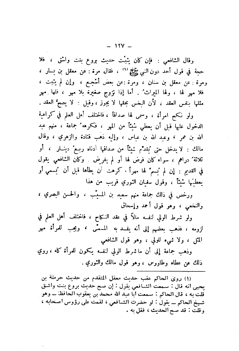 وَقَالَ الشَّافِعِيّ: فَإِن كَانَ يثُبت حَدِيث بروع بنت واشق، فَلَا حجَّة فِي قَول أحد دون النَّبِيّ صَلَّى اللهُ عَلَيْهِ وَسَلَّمَ، فَقَالَ مرّة: عَنْ معقل بْن يَسَار، وَمرَّة عَنْ معقل بْن سِنَان، وَمرَّة عَنْ بعض أَشْجَع، وَإِن لم يثبت، فَلَا مهر لَهَا، وَلها الميراثُ، أما إِذا تزوج صَغِيرَة بِلَا مهر، فلهَا مهر مثلهَا بِنَفس العقد، لِأَن البخس بِحَقِّهَا لَا يجوز، وَقيل: لَا يصحُّ العقد.
