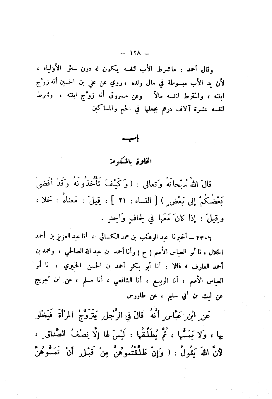 ح وَأَنا أَحْمَدُ بْنُ عَبْدِ اللَّهِ الصَّالِحِيُّ، وَمُحَمَّدُ بْنُ أَحْمَدَ الْعَارِفُ، قَالا: أَنا أَبُو بَكْرٍ أَحْمَدُ بْنُ الْحَسَنِ الْحِيرِيُّ نَا أَبُو الْعَبَّاسِ الأَصَمُّ، أَنا الرَّبِيعُ، أَنا الشَّافِعِيُّ، أَنا مُسْلِمٌ، عَنِ ابْنِ جُرَيْجٍ، عَنْ لَيْثِ بْنِ أَبِي سُلَيْمٍ، عَنْ طَاوُسٍ، عَنِ ابْنِ عَبَّاسٍ، أَنَّهُ قَالَ فِي الرَّجُلِ يَتَزَوَّجُ الْمَرْأَةَ، فَيَخْلُو بِهَا، وَلا يَمَسُّهَا، ثُمَّ يُطَلِّقُهَا: " لَيْسَ لَهَا إِلا نِصْفُ الصَّدَاقِ، لأَنَّ اللَّهَ يَقُولُ: {وَإِنْ طَلَّقْتُمُوهُنَّ مِنْ قَبْلِ أَنْ تَمَسُّوهُنَّ