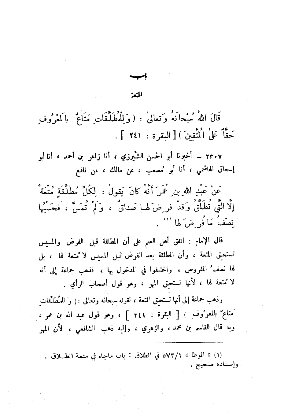2306 - أَخْبَرَنَا أَبُو الْحَسَنِ الشِّيرَزِيُّ، أَنا زَاهِرُ بْنُ أَحْمَدَ، أَنا أَبُو إِسْحَاقَ الْهَاشِمِيُّ، أَنا أَبُو مُصْعَبٍ، عَنْ مَالِكٍ، عَنْ نَافِعٍ، عَنْ عَبْدِ اللَّهِ بْنِ عُمَرَ، أَنَّهُ كَانَ يَقُولُ: «لِكُلِّ مُطَلَّقَةٍ مُتْعَةٌ إِلا الَّتِي تُطَلَّقُ وَقَدْ فُرِضَ لَهَا صَدَاقٌ، وَلَمْ تُمَسَّ، فَحَسْبُهَا نِصْفُ مَا فُرِضَ لَهَا»