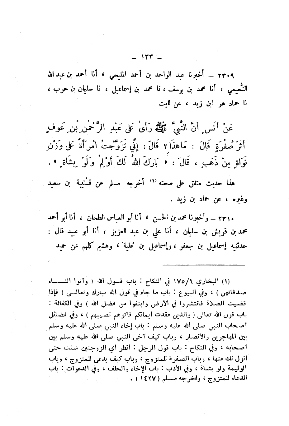 2308 - أَخْبَرَنَا عَبْدُ الْوَاحِدِ بْنُ أَحْمَدَ الْمَلِيحِيُّ، أَنا أَحْمَدُ بْنُ عَبْدِ اللَّهِ النُّعَيْمِيُّ، أَنا مُحَمَّدُ بْنُ يُوسُفَ، نَا مُحَمَّدُ بْنُ إِسْمَاعِيلَ، نَا سُلَيْمَانُ بْنُ حَرْبٍ، نَا حَمَّادٌ هُوَ ابْنُ زَيْدٍ، عَنْ ثَابِتٍ، عَنْ أَنَسٍ، أَنّ النَّبِيَّ صَلَّى اللهُ عَلَيْهِ وَسَلَّمَ رَأَى عَلَى عَبْدِ الرَّحْمَنِ بْنِ عَوْفٍ أَثَرَ صُفْرَةٍ، قَالَ: «مَا هَذَا؟»، قَالَ: إِنِّي تَزَوَّجْتُ امْرَأَةً عَلَى وَزْنِ نَوَاةٍ مِنْ ذَهَبٍ، قَالَ: «بَارَكَ اللَّهُ لَكَ أَوْلِمْ وَلَوْ بِشَاةٍ».