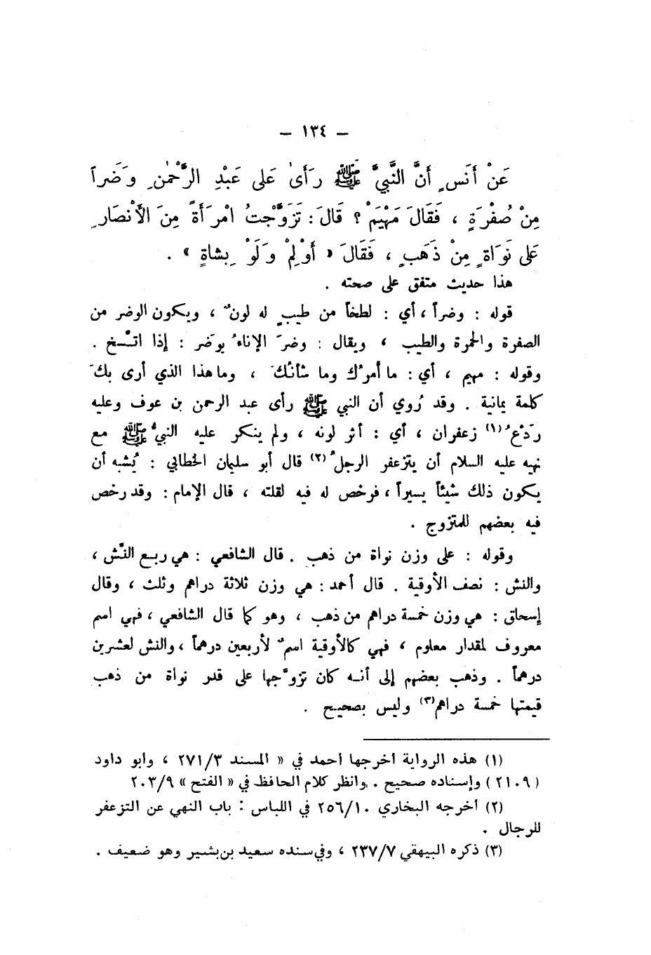 عَنْ أَنَسٍ، أَنَّ النَّبِيَّ صَلَّى اللهُ عَلَيْهِ وَسَلَّمَ رَأَى عَلَى عَبْدِ الرَّحْمَنِ وَضَرًا مِنَ الأَلْوَانِ، فَقَالَ: «مَهْيَمْ؟»، قَالَ: تَزَوَّجْتُ امْرَأَةً مِنَ الأَنْصَارِ عَلَى نَوَاةٍ مِنْ ذَهَبٍ، فَقَالَ: «أَوْلِمْ وَلَوْ بِشَاةٍ».