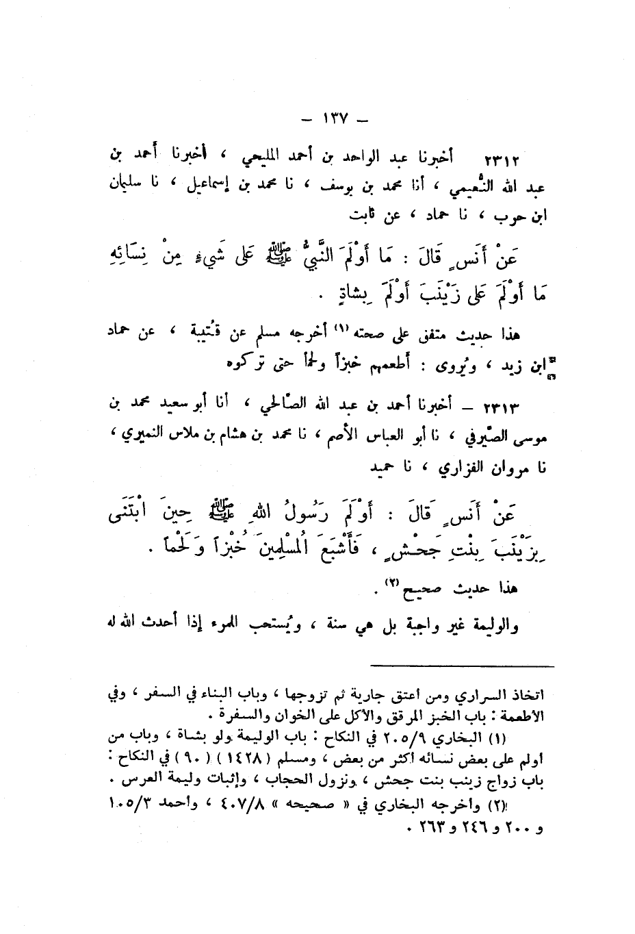 2312 - أَخْبَرَنَا أَحْمَدُ بْنُ عَبْدِ اللَّهِ الصَّالِحِيُّ، أَنا أَبُو سَعِيدٍ مُحَمَّدُ بْنُ مُوسَى الصَّيْرَفِيُّ، نَا أَبُو الْعَبَّاسِ الأَصَمُّ، نَا مُحَمَّدُ بْنُ هِشَامِ بْنِ مِلاسٍ النُّمَيْرِيُّ، نَا مَرْوَانُ الْفَزَارِيُّ، نَا حُمَيْدٌ، عَنْ أَنَسٍ، قَالَ: «أَوْلَمَ رَسُولُ اللَّهِ صَلَّى اللهُ عَلَيْهِ وَسَلَّمَ حِينَ ابْتَنَى بِزَيْنَبَ بِنْتِ جَحْشٍ، فَأَشْبَعَ الْمُسْلِمِينَ خُبْزًا وَلَحْمًا».