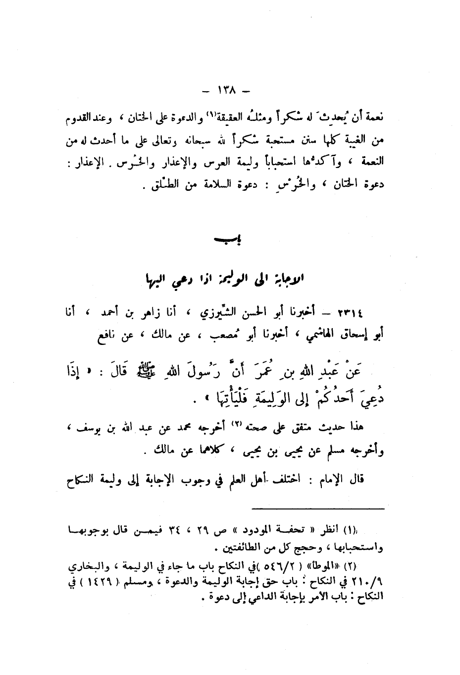 2313 - أَخْبَرَنَا أَبُو الْحَسَنِ الشِّيرَزِيُّ، أَنا زَاهِرُ بْنُ أَحْمَدَ، أَنا أَبُو إِسْحَاقَ الْهَاشِمِيُّ، أَخْبَرَنَا أَبُو مُصْعَبٍ، عَنْ مَالِكٍ، عَنْ نَافِعٍ، عَنْ عَبْدِ اللَّهِ بْنِ عُمَرَ، أَنّ رَسُولَ اللَّهِ صَلَّى اللهُ عَلَيْهِ وَسَلَّمَ، قَالَ: «إِذَا دُعيَ أَحَدُكُمْ إلَى الْوَلِيمَةِ فَلْيَأْتِهَا».