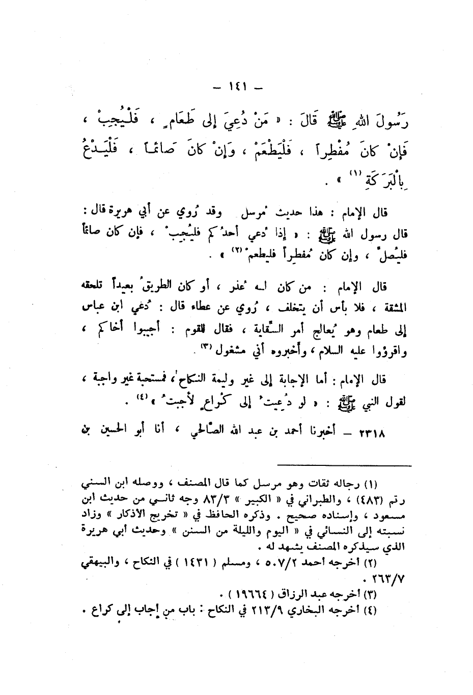 قَالَ الإِمَامُ: هَذَا حَدِيث مُرسل، وَقَدْ رُوِيَ عَنْ أَبِي هُرَيْرَةَ، قَالَ: قَالَ رَسُولُ اللَّه صَلَّى اللهُ عَلَيْهِ وَسَلَّمَ: «إِذَا دُعِيَ أَحَدُكُمْ فَلْيُجِبْ، فَإِنْ كَانَ صَائِمًا فَلْيُصَلِّ، وَإِنْ كَانَ مُفْطِرًا فَلْيَطْعَمْ»