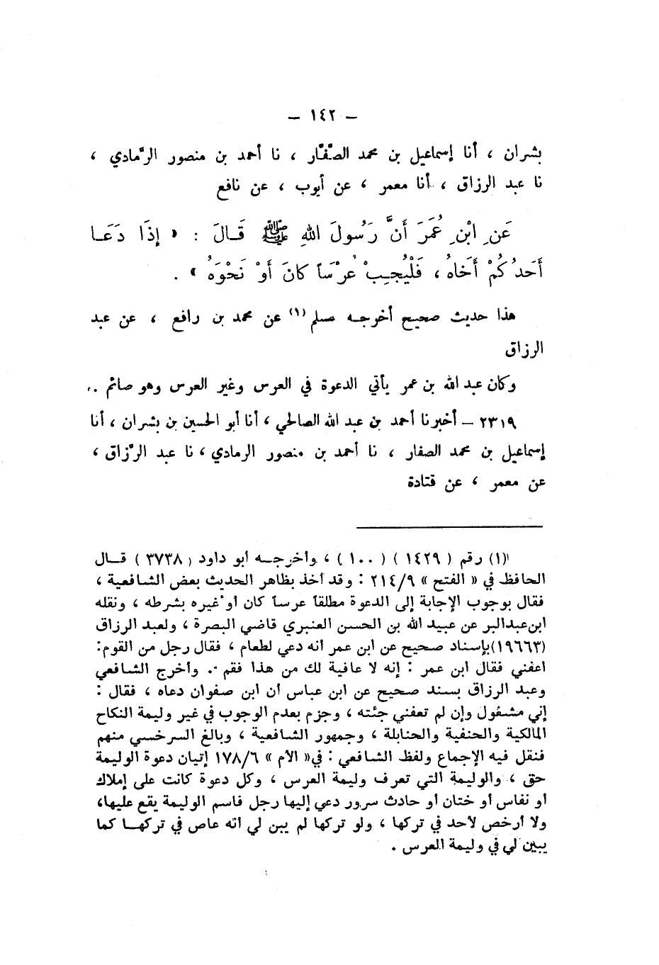بِشْرَانَ، أَنا إِسْمَاعِيلُ بْنُ مُحَمَّدٍ الصَّفَّارُ، نَا أَحْمَدُ بْنُ مَنْصُورٍ الرَّمَادِيُّ، نَا عَبْدُ الرَّزَّاقِ، أَنا مَعْمَرٌ، عَنْ أَيُّوبَ، عَنْ نَافِعٍ، عَنِ ابْنِ عُمَرَ، أَنّ رَسُولَ اللَّه صَلَّى اللهُ عَلَيْهِ وَسَلَّمَ، قَالَ: «إِذَا دَعَا أَحَدُكُمْ أَخَاهُ، فَلْيُجِبْ عُرْسًا كَانَ أَوْ نَحْوَهُ».