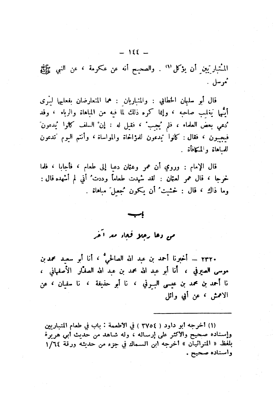 قَالَ الإِمَامُ: وَرُوِيَ أَن عُمَر، وَعُثْمَان، دعيا إِلَى طَعَام، فأجابا، فَلَمَّا خرجا، قَالَ عُمَر لعُثْمَان: " لقد شهِدت طَعَاما وددتُ أَنِّي لم أشهده، قَالَ: وَمَا ذَلِكَ، قَالَ: خشيتُ أَن يكون جُعِلَ مباهاة ".