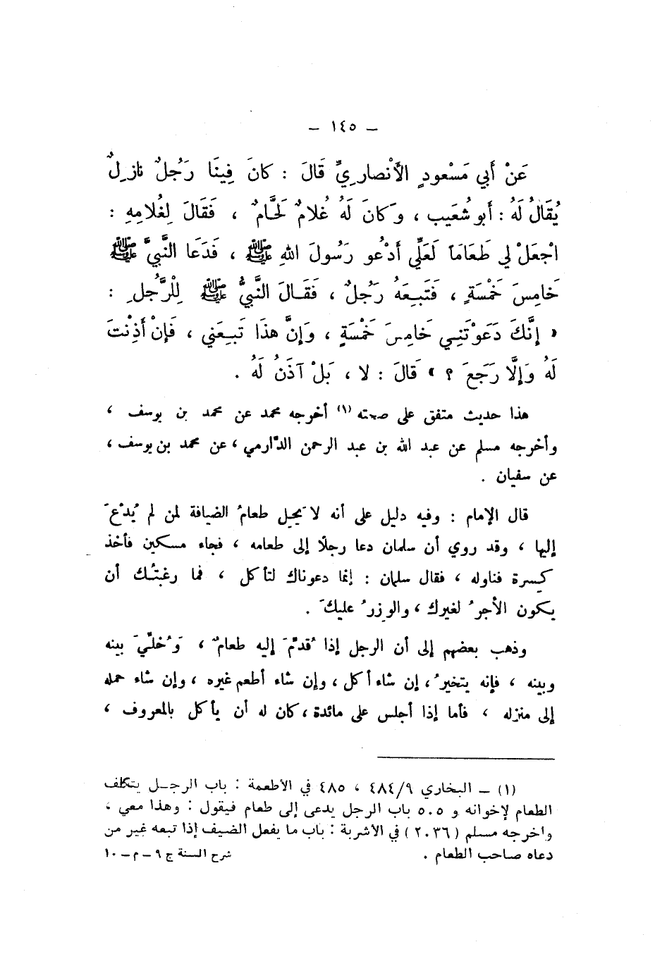 عَنْ أَبِي مَسْعُودٍ الأَنْصَارِيِّ، قَالَ: كَانَ فِينَا رَجُلٌ نَازِلٌ، يُقَالُ لَهُ: أَبُو شُعَيْبٍ، وَكَانَ لَهُ غُلامٌ لَحَّامٌ، فَقَالَ لِغُلامِهِ: اجْعَلْ لِي طَعَامًا لَعَلِّي أَدْعُو رَسُولَ اللَّهِ صَلَّى اللهُ عَلَيْهِ وَسَلَّمَ، فَدَعَا النَّبِيَّ صَلَّى اللهُ عَلَيْهِ وَسَلَّمَ خَامِسَ خَمْسَةٍ، فَتَبِعَهُ رَجُلٌ، فَقَالَ النَّبِيُّ صَلَّى اللهُ عَلَيْهِ وَسَلَّمَ لِلرَّجُلِ: «إِنَّكَ دَعَوْتَنِي خَامِسَ خَمْسَةٍ، وَإِنَّ هَذَا تَبِعَنِي، فَإِنْ أَذِنْتَ لَهُ وَإِلا رَجَعَ؟»، قَالَ: لَا، بَلْ آذَنُ لَهُ ".