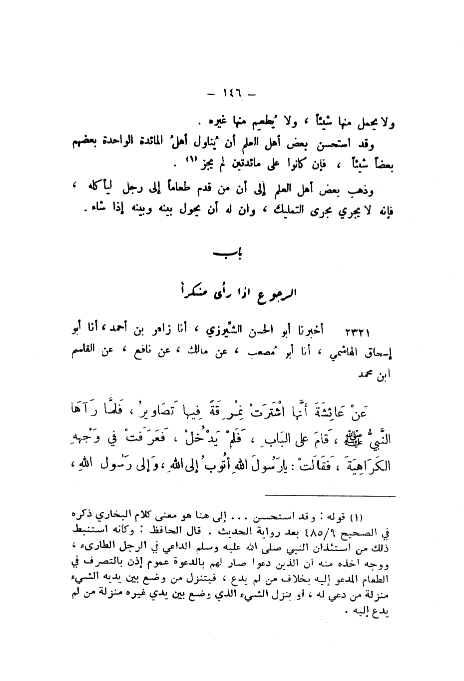 2321 - أَخْبَرَنَا أَبُو الْحَسَنِ الشِّيرَزِيُّ، أَنا زَاهِرُ بْنُ أَحْمَدَ، أَنا أَبُو إِسْحَاقَ الْهَاشِمِيُّ، أَنا أَبُو مُصْعَبٍ، عَنْ مَالِكٍ، عَنْ نَافِعٍ، عَنِ الْقَاسِمِ بْنِ مُحَمَّدٍ، عَنْ عَائِشَةَ، أنَّهَا اشْتَرَتْ نِمْرِقَةً فِيهَا تَصَاوِيرُ، فَلَمَّا رَآهَا النَّبِيُّ صَلَّى اللهُ عَلَيْهِ وَسَلَّمَ قَامَ عَلَى الْبَابِ، فَلَمْ يَدْخُلْ، فَعَرَفَتْ فِي وَجْهِهِ الْكَرَاهِيَةَ، فَقَالَتْ: يَا رَسُولَ اللَّهِ، أَتُوبُ إِلَى اللَّهِ، وَإِلَى رَسُولِ اللَّهِ،