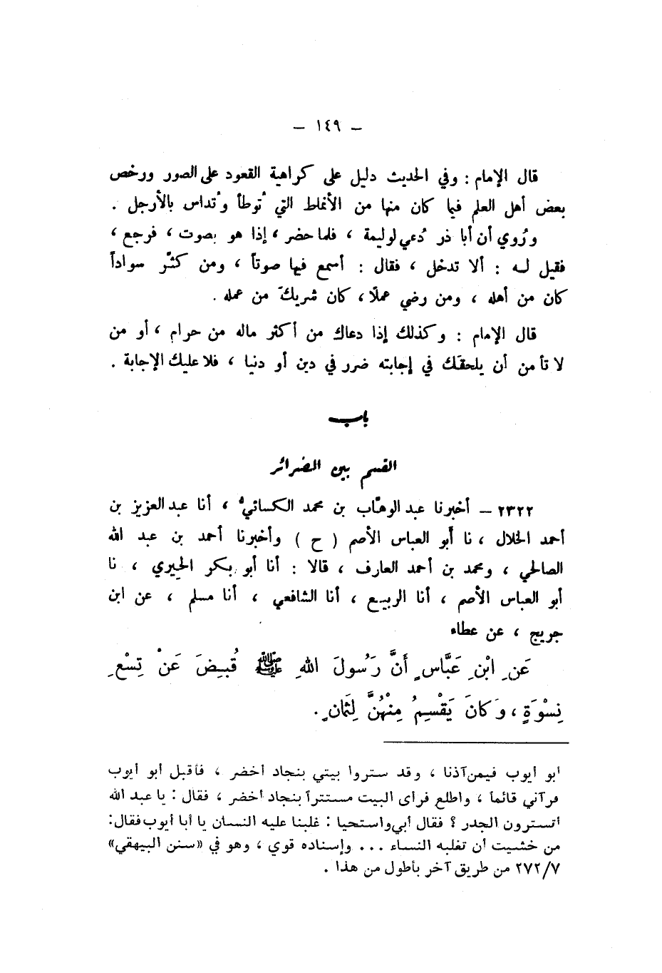 ح وَأَخْبَرَنَا أَحْمَدُ بْنُ عَبْدِ اللَّهِ الصَّالِحِيُّ، وَمُحَمَّدُ بْنُ أَحْمَدَ الْعَارِفُ، قَالا: أَنا أَبُو بَكْرٍ الْحِيرِيُّ، نَا أَبُو الْعَبَّاسِ الأَصَمُّ، أَنا الرَّبِيعُ، أَنا الشَّافِعِيُّ، أَنا مُسْلِمٌ، عَنِ ابْنِ جُرَيْجٍ، عَنْ عَطَاءٍ، عَنِ ابْنِ عَبَّاسٍ، أَنّ رَسُولَ اللَّهِ صَلَّى اللهُ عَلَيْهِ وَسَلَّمَ «قُبِضَ عَنْ تِسْعِ نِسْوَةٍ، وَكَانَ يَقْسِمُ مِنْهُنَّ لِثَمَانٍ».