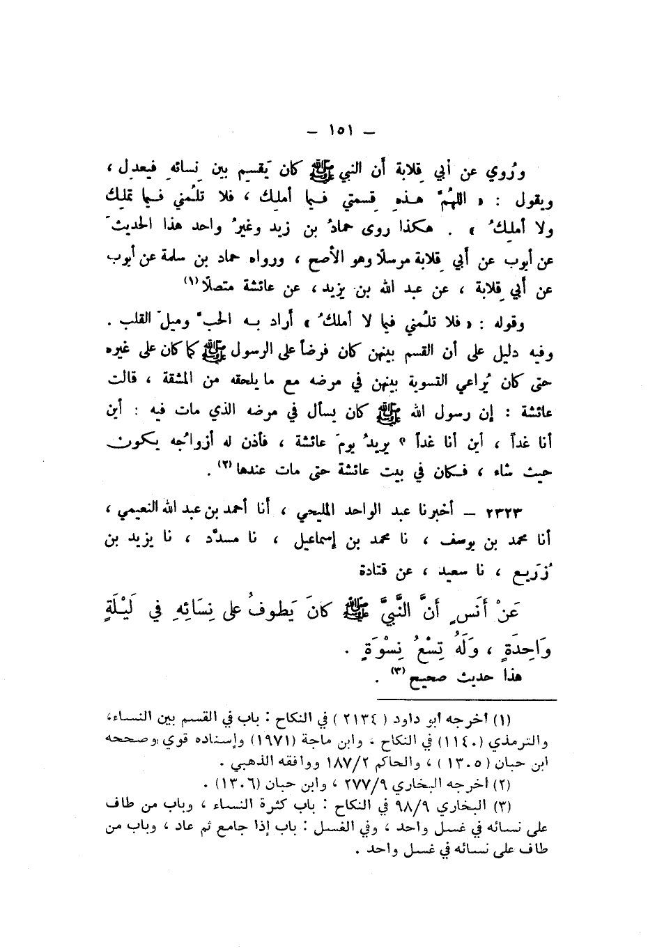 2323 - أَخْبَرَنَا عَبْدُ الْوَاحِدِ الْمَلِيحِيُّ، أَنا أَحْمَدُ بْنُ عَبْدِ اللَّهِ النُّعَيْمِيُّ، أَنا مُحَمَّدُ بْنُ يُوسُفَ، نَا مُحَمَّدُ بْنُ إِسْمَاعِيلَ، نَا مُسَدَّدٌ، نَا يَزِيدُ بْنُ زُرَيْعٍ، نَا سَعِيدٌ، عَنْ قَتَادَةَ، عَنْ أَنَسٍ، «أَنَّ النَّبِيَّ صَلَّى اللهُ عَلَيْهِ وَسَلَّمَ كَانَ يَطُوفُ عَلَى نِسَائِهِ فِي لَيْلَةٍ وَاحِدَةٍ، وَلَهُ تِسْعُ نِسْوَةٍ».