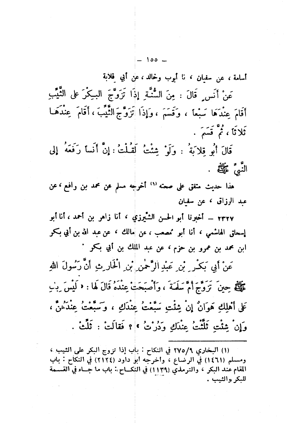 2327 - أَخْبَرَنَا أَبُو الْحَسَنِ الشِّيرَزِيُّ، أَنا زَاهِرُ بْنُ أَحْمَدَ، أَنا أَبُو إِسْحَاقَ الْهَاشِمِيُّ، أَنا أَبُو مُصْعَبٍ، عَنْ مَالِكٍ، عَنْ عَبْدِ اللَّهِ بْنِ أَبِي بَكْرِ بْنِ مُحَمَّدِ بْنِ عَمْرِو بْنِ حَزْمٍ، عَنْ عَبْدِ الْمَلِكِ بْنِ أَبِي بَكْرٍ، عَنْ أَبِي بَكْرِ بْنِ عَبْدِ الرَّحْمَنِ بْنِ الْحَارِثِ، أَنَّ رَسُولَ اللَّهِ صَلَّى اللهُ عَلَيْهِ وَسَلَّمَ حِينَ تَزَوَّجَ أُمَّ سَلَمَةَ، وَأَصْبَحَتْ عِنْدَهُ، قَالَ لَها: «لَيْسَ بِكِ عَلَى أَهْلِكِ هَوَانٌ إِنْ شِئْتِ سَبَّعْتُ عِنْدَكِ، وَسَبَّعْتُ عِنْدَهُنَّ، وَإِنْ شِئْتِ ثَلَّثْتُ عِنْدَكِ وَدُرْتُ».