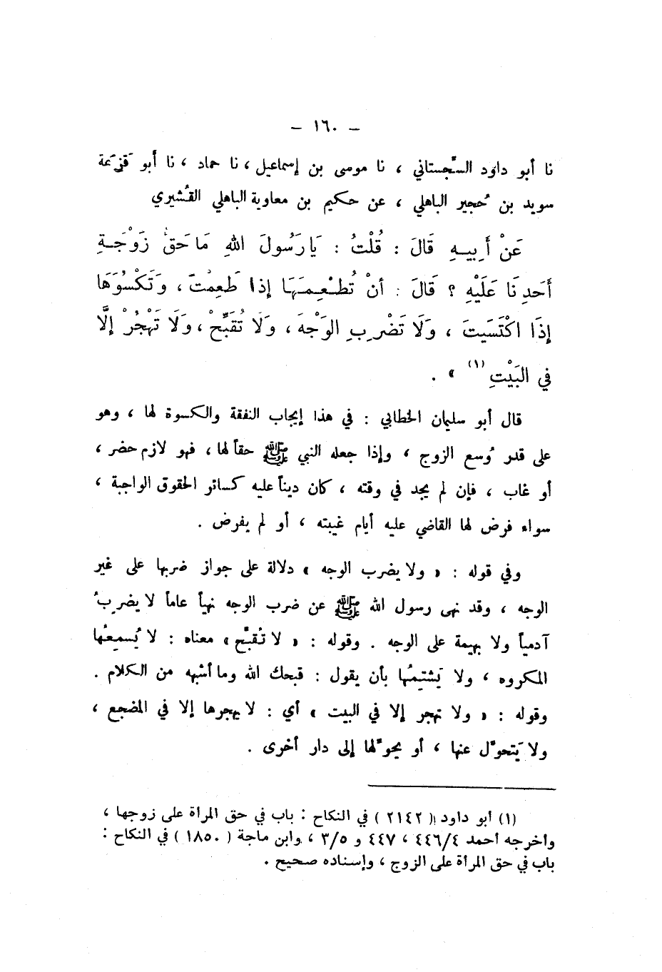 نَا أَبُو دَاوُدَ السِّجِسْتَانِيُّ، نَا مُوسَى بْنُ إِسْمَاعِيلَ، نَا حَمَّادٌ، نَا أَبُو قَزْعَةَ سُوَيْدُ بْنُ حُجَيْرٍ الْبَاهِلِيُّ، عَنْ حَكِيمِ بْنِ مُعَاوِيَةَ الْبَاهِلِيِّ الْقُشَيْرِيِّ، عَنْ أَبِيهِ، قَالَ: قُلْتُ: يَا رَسُولَ اللَّهِ، مَا حَقُّ زَوْجَةِ أَحَدِنَا عَلَيْهِ؟ قَالَ: «أَنْ تُطْعِمَهَا إِذَا طَعِمْتَ، وَتَكْسُوهَا إِذَا اكْتَسَيْتَ، وَلا تَضْرِبَ الْوَجْهَ، وَلا تُقَبِّحْ، وَلا تَهْجُرْ إِلا فِي الْبَيْتِ»