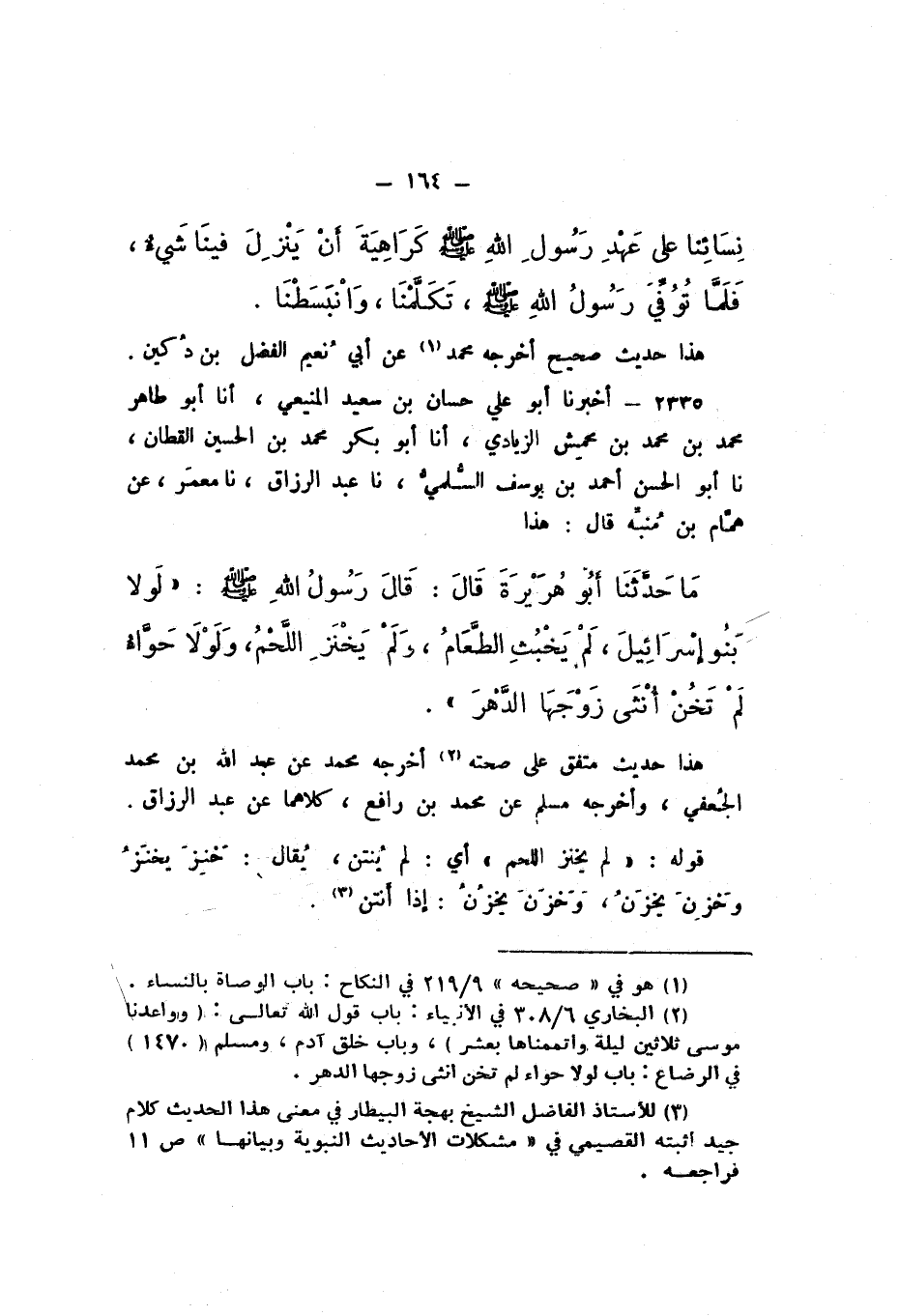 نِسَائِنَا عَلَى عَهْدِ رَسُولِ اللَّهِ صَلَّى اللهُ عَلَيْهِ وَسَلَّمَ كَرَاهِيَةَ أَنْ يَنْزِلَ فِينَا شَيْءٌ، فَلَمَّا تُوُفِّيَ رَسُولُ اللَّه صَلَّى اللهُ عَلَيْهِ وَسَلَّمَ تَكَلَّمْنَا، وَانْبَسَطْنَا».
