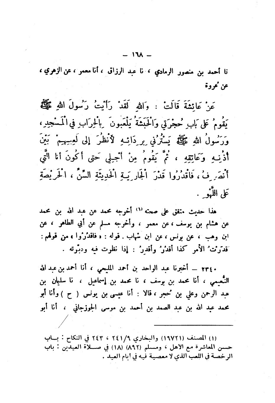 نَا أَحْمَدُ بْنُ مَنْصُورٍ الرَّمَادِيُّ، نَا عَبْدُ الرَّزَّاقِ، أَنا مَعْمَرٌ، عَنِ الزُّهْرِيِّ، عَنْ عُرْوَةَ، عَنْ عَائِشَةَ، قَالت: «وَاللَّهِ لَقَدْ رَأَيْتُ رَسُولَ اللَّهِ صَلَّى اللهُ عَلَيْهِ وَسَلَّمَ يَقُومُ عَلَى بَابِ حُجْرَتِي، وَالْحَبَشَةُ يَلْعَبُونَ بِالْحِرَابِ فِي الْمَسْجِدِ، وَرَسُولُ اللَّهِ يَسْتُرُنِي بِرِدَائِهِ لأَنْظُرَ إِلَى لَعِبِهِمْ بَيْنَ أُذُنِهِ وَعَاتِقِهِ، ثُمَّ يَقُومُ مِنْ أَجْلِي حَتَّى أَكُونَ أَنَا الَّتِي أَنْصَرِفُ، فَاقْدُرُوا قَدْرَ الْجَارِيَةِ الْحَدِيثَةِ السِّنِّ، الْحَرِيصَةِ عَلَى اللَّهْوِ».