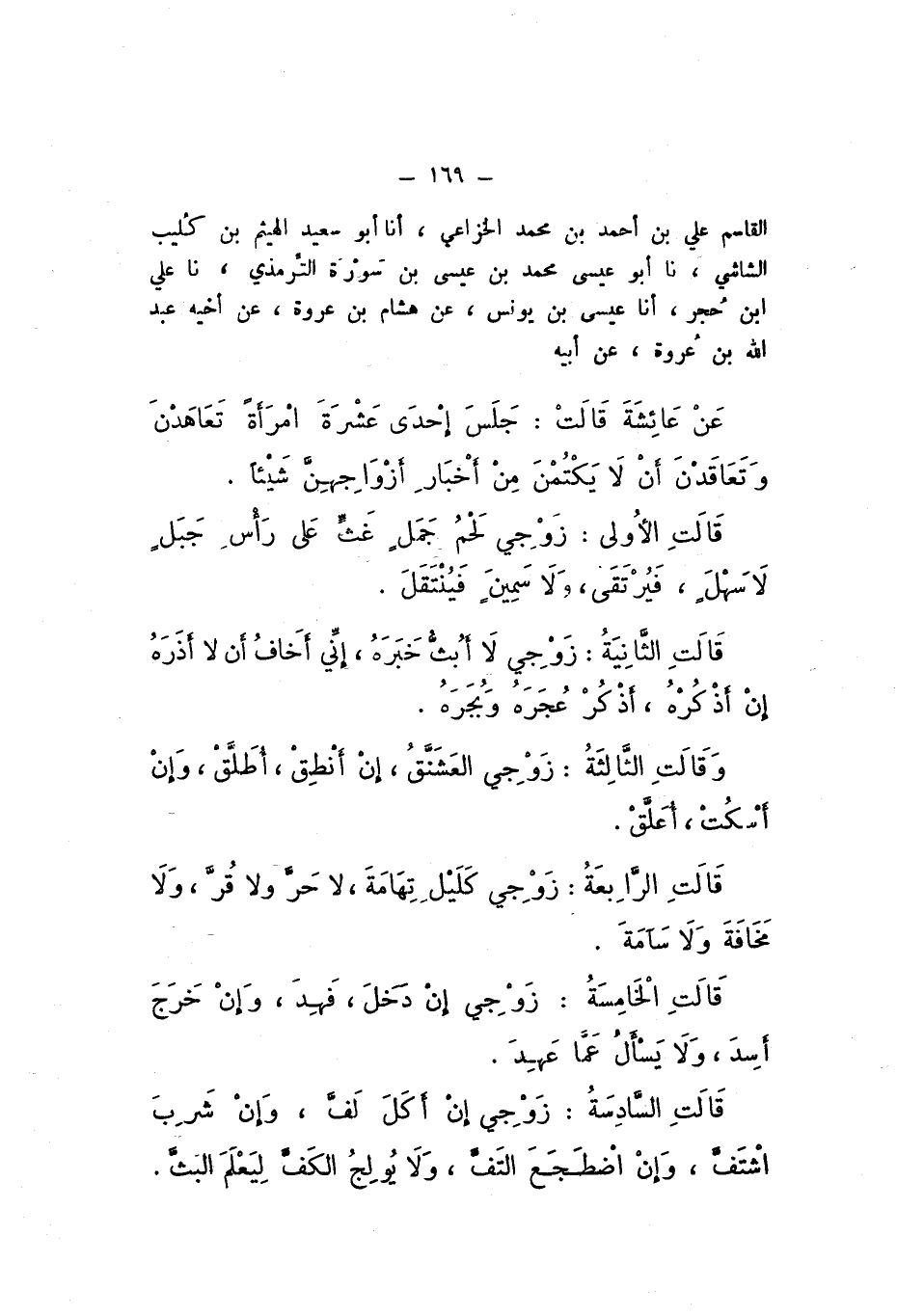 الْقَاسِمِ عَلِيُّ بْنُ أَحْمَدَ بْنِ مُحَمَّدٍ الْخُزَاعِيُّ، أَنا أَبُو سَعِيدٍ الْهَيْثَمُ بْنُ كُلَيْبٍ الشَّاشِيُّ، نَا أَبُو عِيسَى مُحَمَّدُ بْنُ عِيسَى بْنِ سَوْرَةَ التِّرْمِذِيُّ، نَا عَلِيُّ بْنُ حُجْرٍ، أَنا عِيسَى بْنُ يُونُسَ، عَنْ هِشَامِ بْنِ عُرْوَةَ، عَنْ أَخِيهِ عَبْدِ اللَّهِ بْنِ عُرْوَةَ، عَنْ أَبِيهِ، عَنْ عَائِشَةَ، قَالَتْ: " جَلَسَ إِحْدَى عَشْرَةَ امْرأَةً تَعَاهَدْنَ وَتَعَاقَدْنَ أَنْ لَا يَكْتُمْنَ مِنْ أَخْبَارِ أَزْوَاجهِنَّ شَيْئًا، قَالَتِ الأُولَى: زَوْجِي لَحْمُ جَمَلٍ غَثٍّ عَلَى رَأْسِ جَبَلٍ لَا سَهْلٍ، فَيُرْتَقَى، وَلا سمينٍ فَيُنْتَقَلَ.