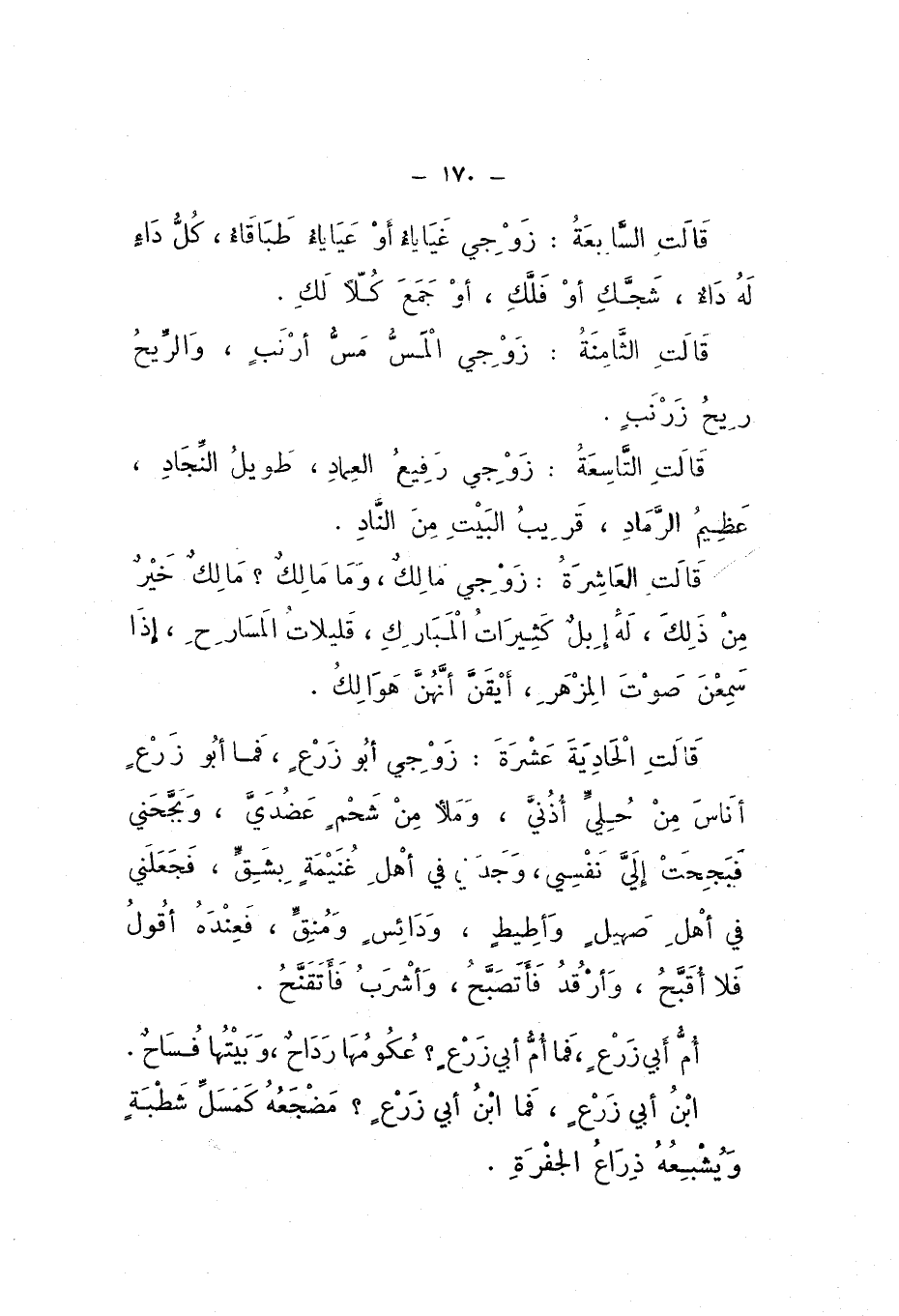 قَالَتِ الْحَادِيَةَ عَشْرَةَ: زَوْجي أَبُو زَرْعٍ، فَمَا أبُو زَرْعٍ أنَاس مِنْ حُلِيٍّ أُذُنَيَّ، وَمَلأَ مِنْ شَحْمٍ عَضُدَيَّ، وَبَجَّحَنِي فَبَجِحَتْ إِلَيَّ نَفْسِي، وَجَدَنِي فِي أَهْلِ غُنَيْمَةٍ بِشِقٍّ، فَجَعَلَني فِي أَهْلِ صَهِيلٍ وَأَطِيطٍ، وَدَائِسٍ وَمُنِقٍّ، فَعِنْدَهُ أَقُولُ فَلا أُقَبَّحُ، وَأرْقُدُ فَأَتَصَبَّحُ، وأَشْرَبُ فأَتَقَنَّحُ.