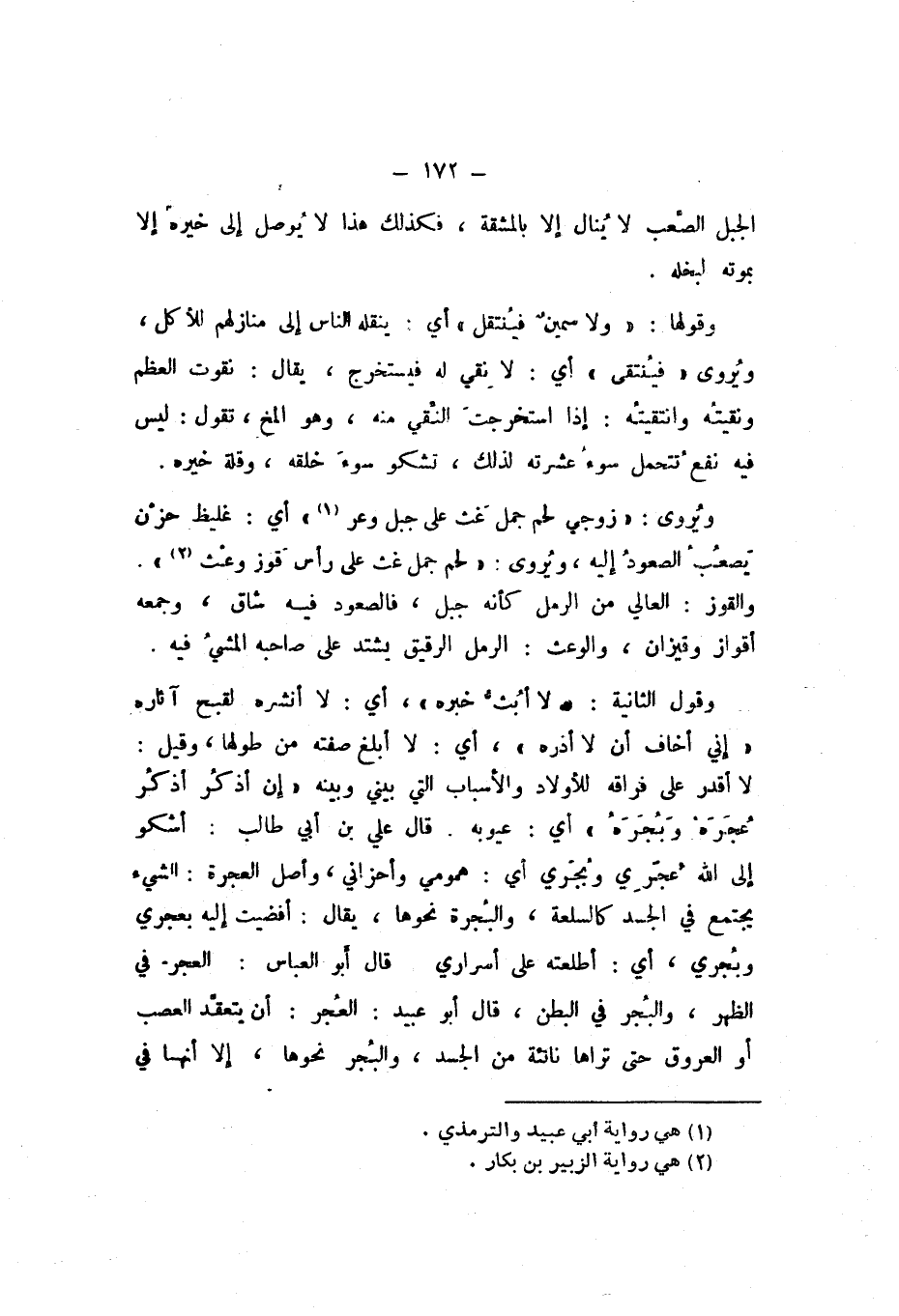 ويُروى: «زَوْجي لحمُ جَمَلٍ غَثٍّ على جَبَلٍ وَعْرٍ»، أَي: غليظ حزْن يصعُب الصعُود إِلَيْهِ، ويُروى: «لحمُ جَمَلٍ غَثٍّ على رأسِ قَوْزِ وَعْثٍ».