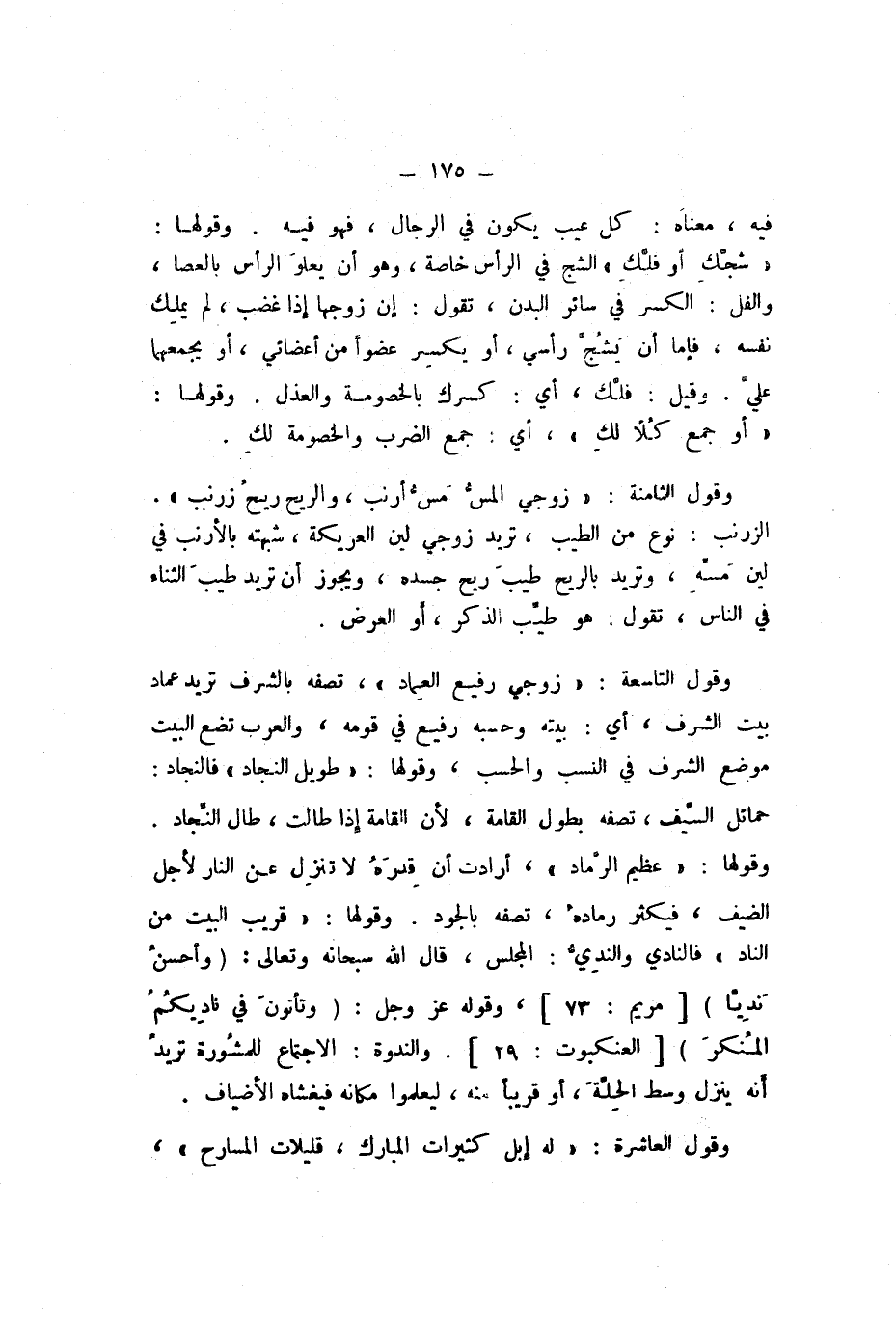 وَقَوْلها: «قريبُ البيتِ مِنَ النَّادِ»، فالنادي والندِيُّ: الْمجْلس، قَالَ اللَّه سُبْحَانَهُ وَتَعَالَى: {وَأَحْسَنُ نَدِيًّا} [مَرْيَم: 73]، وَقَوله عَزَّ وَجَلَّ: {وَتَأْتُونَ فِي نَادِيكُمُ الْمُنْكَرَ} [العنكبوت: 29].