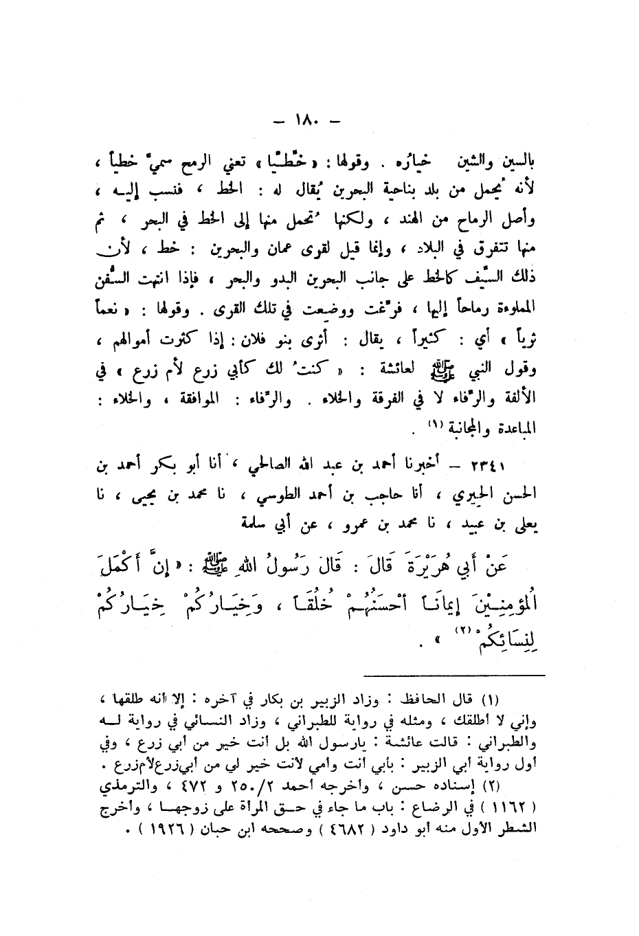 2341 - أَخْبَرَنَا أَحْمَدُ بْنُ عَبْدِ اللَّهِ الصَّالِحِيُّ، أَنا أَبُو بَكْرٍ أَحْمَدُ بْنُ الْحَسَنِ الْحِيرِيُّ، أَنا حَاجِبُ بْنُ أَحْمَدَ الطُّوسِيُّ، نَا مُحَمَّدُ بْنُ يَحْيَى، نَا يَعْلَى بْنِ عُبَيْدٍ، نَا مُحَمَّدُ بْنُ عَمْرٍو، عَنْ أَبِي سَلَمَةَ، عَنْ أَبي هُرَيْرَةَ، قَالَ: قَالَ رَسُولُ اللَّهِ صَلَّى اللهُ عَلَيْهِ وَسَلَّمَ: «إنَّ أَكْمَلَ الْمُؤْمِنِينَ إِيمَانًا أحْسَنُهُمْ خُلُقًا، وَخِيَارُكُمْ خِيَارُكْم لِنِسَائِكُمْ».