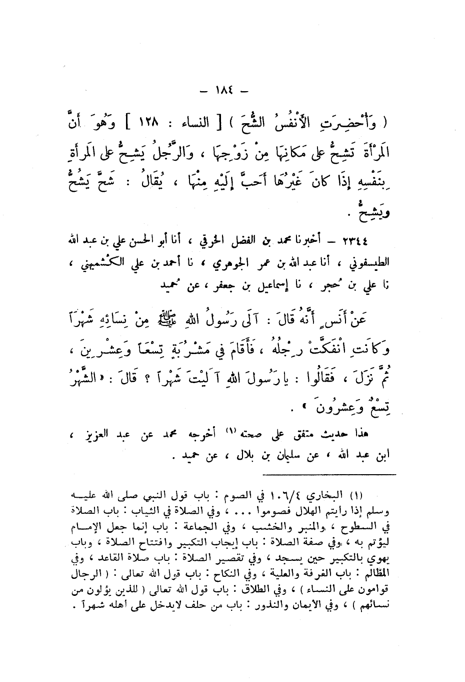 2344 - أَخْبَرَنَا مُحَمَّدُ بْنُ الْفَضْلِ الْخِرَقِيُّ، أَنا أَبُو الْحَسَنِ عَلِيُّ بْنُ عَبْدِ اللَّهِ الطَّيْسَفُونِيُّ، أَنا عَبْدُ اللَّهِ بْنُ عُمَرَ الْجَوْهَرِيُّ، نَا أَحْمَدُ بْنُ عَلِيٍّ الْكُشْمِيهَنِيُّ، نَا عَلِيُّ بْنُ حُجْرٍ، نَا إِسْمَاعِيلُ بْنُ جَعْفَرٍ، عَنْ حُمَيْدٍ، عَنْ أَنسٍ، أَنَّهُ قَالَ: آلَى رَسُولُ اللَّهِ صَلَّى اللهُ عَلَيْهِ وَسَلَّمَ مِنْ نِسَائِهِ شَهْرًا، وَكَانتِ انْفَكَّتْ رِجْلُهُ، فَأَقَامَ فِي مَشْرُبَةٍ تِسْعًا وَعِشْرينَ، ثُمَّ نَزَلَ، فَقَالُوا: يَا رَسُولَ اللَّهِ، آليْتَ شَهْرًا؟ قَالَ: «الشَّهْرُ تِسْعٌ وَعِشْرُونَ».