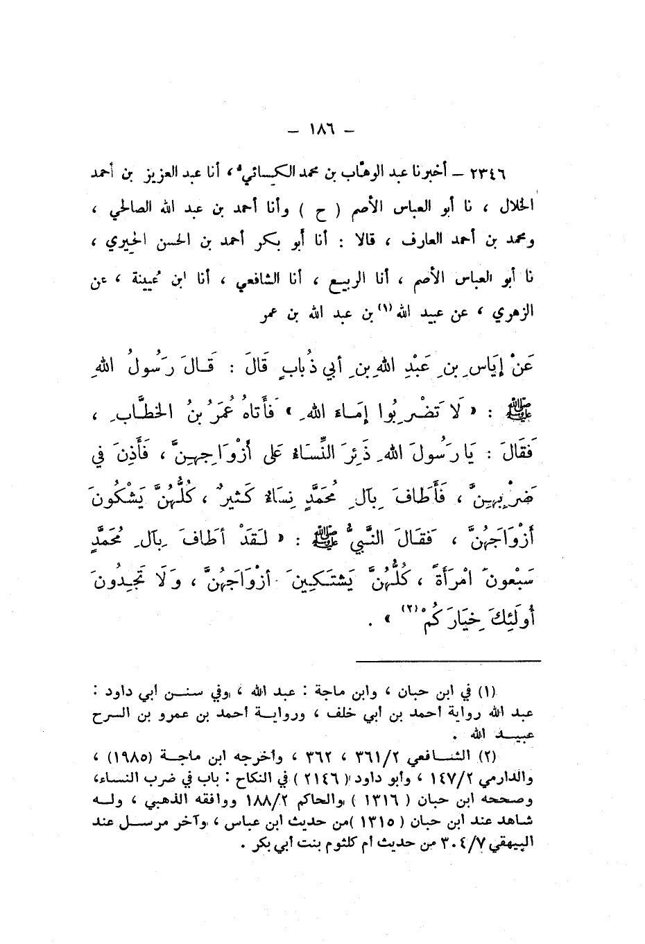 ح وَأَنا أَحْمَدُ بْنُ عَبْدِ اللَّهِ الصَّالِحِيُّ، وَمُحَمَّدُ بْنُ أَحْمَدَ الْعَارِفُ، قَالا: أَنا أَبُو بَكْرٍ أَحْمَدُ بْنُ الْحَسَنِ الْحِيرِيُّ، نَا أَبُو الْعَبَّاسِ الأَصَمُّ، أَنا الرَّبِيعُ، أَنا الشَّافِعِيُّ، أَنا ابْنُ عُيَيْنَةَ، عَنِ الزُّهْرِيِّ، عَنْ عُبَيْدِ اللَّهِ بْنِ عَبْدِ اللَّهِ بْنِ عُمَرَ، عَنْ إِيَاسِ بْنِ عَبْدِ اللَّهِ بْنِ أَبِي ذُبَابٍ، قَالَ: قَالَ رَسُولُ اللَّهِ صَلَّى اللهُ عَلَيْهِ وَسَلَّمَ: «لَا تَضْرِبُوا إِمَاءَ اللَّهِ»، فَأَتَاهُ عُمَرُ بْنُ الْخَطَّابِ، فَقَالَ: يَا رَسُولَ اللَّهِ، ذَئِرَ النِّسَاءِ عَلَى أَزْوَاجِهِنَّ، فَأَذِنَ فِي ضَرْبِهِنَّ، فَأَطَافَ بِآلِ مُحَمَّدٍ نِسَاءٌ كَثِيرٌ، كُلُّهُنَّ يَشْكُونَ أَزْوَاجَهُنَّ، فَقَالَ النَّبِيُّ صَلَّى اللهُ عَلَيْهِ وَسَلَّمَ: «لَقَدْ أَطَافَ بِآلِ مُحَمَّدٍ سَبْعُونَ امْرَأَةً، كُلُّهُنَّ يَشْتَكِينَ أَزْوَاجَهُنَّ، وَلا تَجِدُونَ أُولَئِكَ خِيَارَكُمْ»
