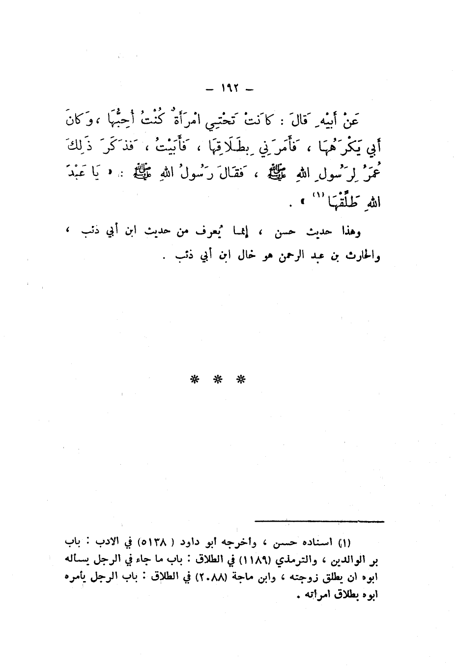 عَنْ أَبِيهِ، قَالَ: كَانَتْ تَحْتِي امْرَأَةٌ كُنْتُ أُحِبُّهَا، وَكَانَ أَبِي يَكْرَهُهَا، فَأَمَرَنِي بِطَلاقِهَا، فَأَبَيْتُ، فَذَكَرَ ذَلِكَ عُمَرُ لِرَسُولِ اللَّهِ صَلَّى اللهُ عَلَيْهِ وَسَلَّمَ، فَقَالَ رَسُولُ اللَّهِ صَلَّى اللهُ عَلَيْهِ وَسَلَّمَ: «يَا عَبْدَ اللَّهِ، طِلِّقْهَا».