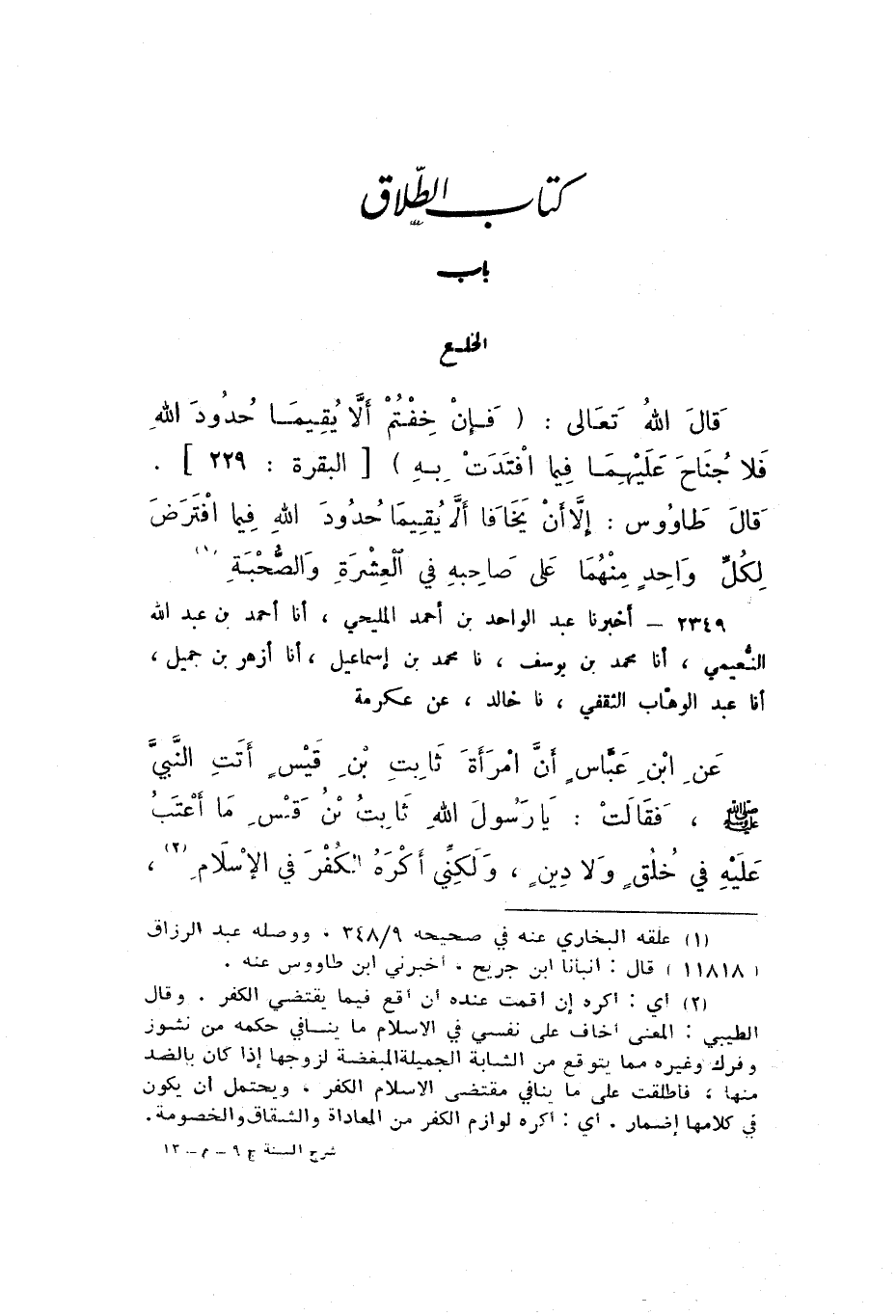 2349 - أَخْبَرَنَا عَبْدُ الْوَاحِدِ بْنُ أَحْمَدَ الْمَلِيحِيُّ، أَنا أَحْمَدُ بْنُ عَبْدِ اللَّهِ النُّعَيْمِيُّ، أَنا مُحَمَّدُ بْنُ يُوسُفَ، نَا مُحَمَّد بْن إِسْمَاعِيل، أَنا أَزْهَرُ بْنُ جَمِيلٍ، أَنا عَبْدُ الْوَهَّابِ الثَّقَفِيُّ، نَا خَالِدٌ، عَنْ عِكْرِمَةَ، عَنِ ابْنِ عَبَّاسٍ، أَنَّ امْرَأَةَ ثَابِتِ بْنِ قَيْسٍ أَتَتِ النَّبِيَّ صَلَّى اللهُ عَلَيْهِ وَسَلَّمَ، فَقَالَتْ: يَا رَسُولَ اللَّهِ، ثَابِتُ بْنُ قَيْسٍ مَا أَعْتِبُ عَلَيْهِ فِي خُلُقٍ وَلا دِينٍ، وَلَكِنِّي أَكْرَهُ الْكُفْرَ فِي الإِسْلامِ،