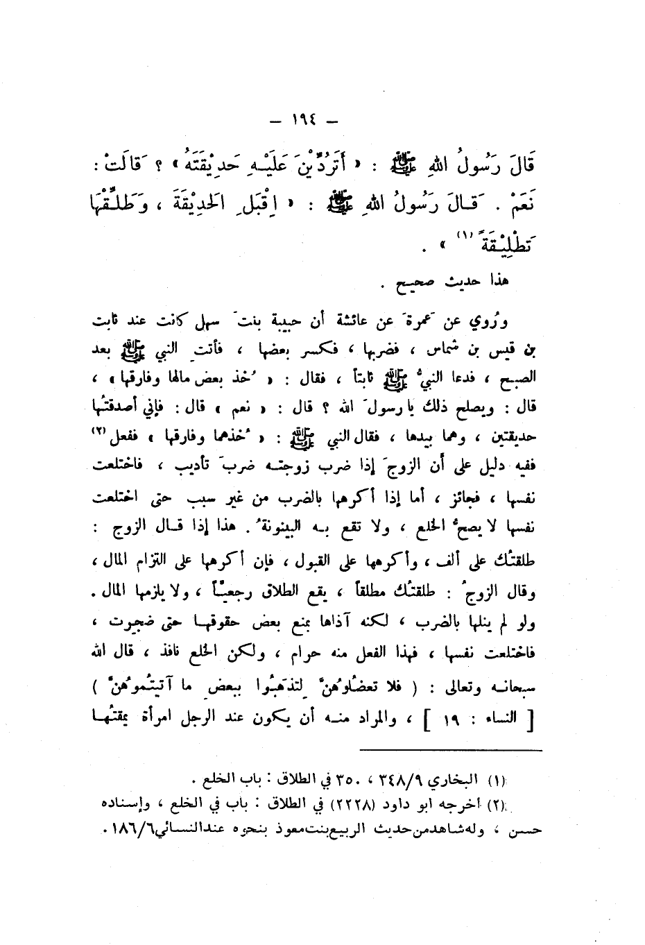 ورُوي عَنْ عَمْرَةَ، عَنْ عَائِشَةَ، أَنَّ حَبِيبَةَ بِنْتَ سَهْلٍ، كَانَتْ عِنْدَ ثَابِتِ بْنِ قَيْسِ بْنِ شَمَّاسٍ، فَضَرَبَهَا، فَكَسَرَ بَعْضَهَا، فَأَتَتِ النَّبِيَّ صَلَّى اللهُ عَلَيْهِ وَسَلَّمَ بَعْدَ الصُّبْحِ، فَدَعَا النَّبِيُّ صَلَّى اللهُ عَلَيْهِ وَسَلَّمَ ثَابِتًا، فَقَالَ: «خُذْ بَعْضَ مَالِهَا وَفَارِقْهَا»، قَالَ: وَيَصْلُحُ ذَلِكَ يَا رَسُولَ اللَّهِ؟ قَالَ: «نَعَمْ»، قَالَ: فَإِنِّي أَصْدَقْتُهَا حَدِيقَتَيْنِ، وَهُمَا بِيَدِهَا، فَقَالَ النَّبِيُّ صَلَّى اللهُ عَلَيْهِ وَسَلَّمَ: «خُذْهُمَا وَفَارِقْهَا».