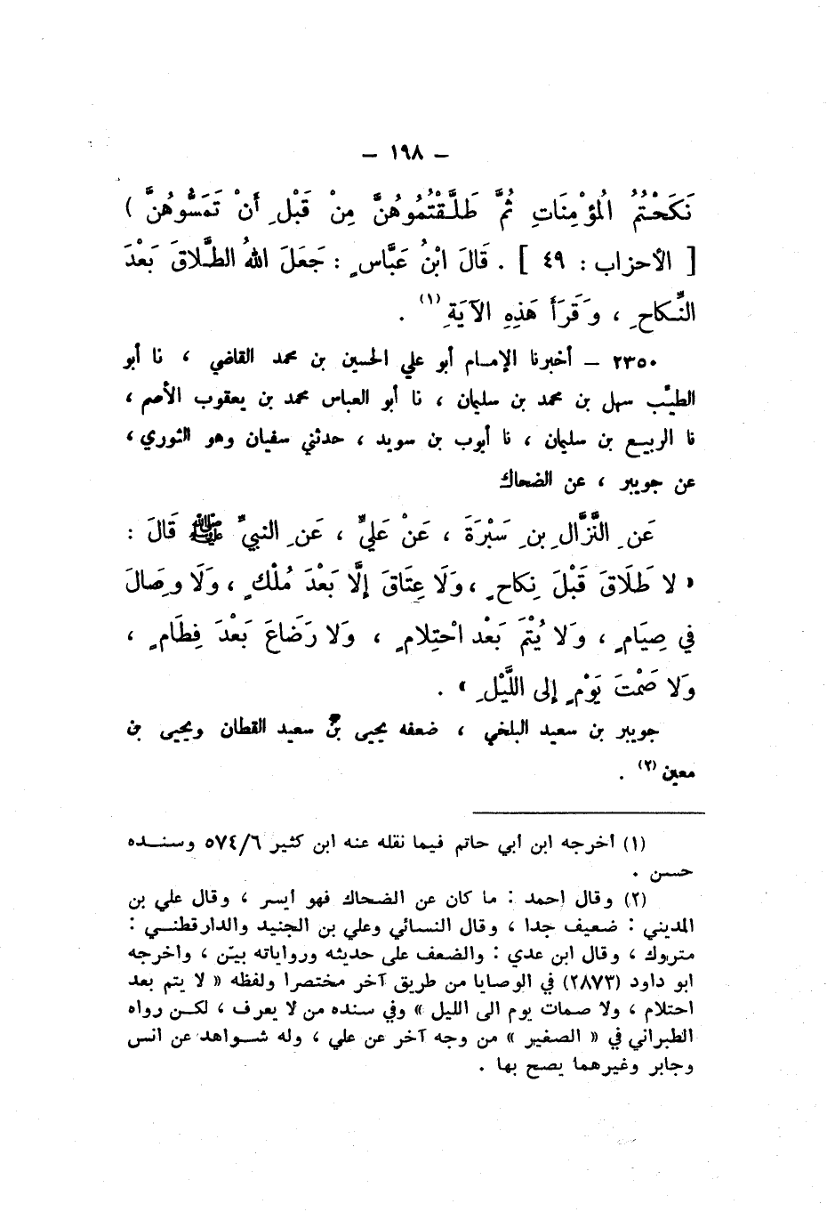 2350 - أَخْبَرَنَا الإِمَامُ أَبُو عَلِيٍّ الْحُسَيْنُ بْنُ مُحَمَّدٍ الْقَاضِي، نَا أَبُو الطيَّبِ سَهْلُ بْنُ مُحَمَّدِ بْنِ سُلَيْمَانَ، نَا أَبُو الْعَبَّاسِ مُحَمَّدُ بْنُ يَعْقُوبَ الأَصَمُّ، نَا الرَّبِيعُ بْنُ سُلَيْمَانَ، نَا أَيُّوبُ بْنُ سُوَيْدٍ، حَدَّثَنِي سُفْيَانُ وَهُوَ الثَّوْرِيُّ، عَنْ جُوَيْبِرٍ، عَنِ الضَّحَّاكِ، عَنِ النَّزَّالِ بْنِ سَبْرَةَ، عَنْ عَلِيٍّ، عَنِ النَّبِيِّ صَلَّى اللهُ عَلَيْهِ وَسَلَّمَ، قَالَ: «لَا طَلاقَ قَبْلَ نِكَاحٍ، وَلا عِتَاقَ إِلا بَعْدَ مِلْكٍ، وَلا وِصَالَ فِي صِيَامٍ، وَلا يُتْمَ بَعْدَ احْتِلامٍ، وَلا رَضَاعَ بَعْدَ فِطَامٍ، وَلا صَمْتَ يَوْمٍ إِلَى اللَّيْلِ»