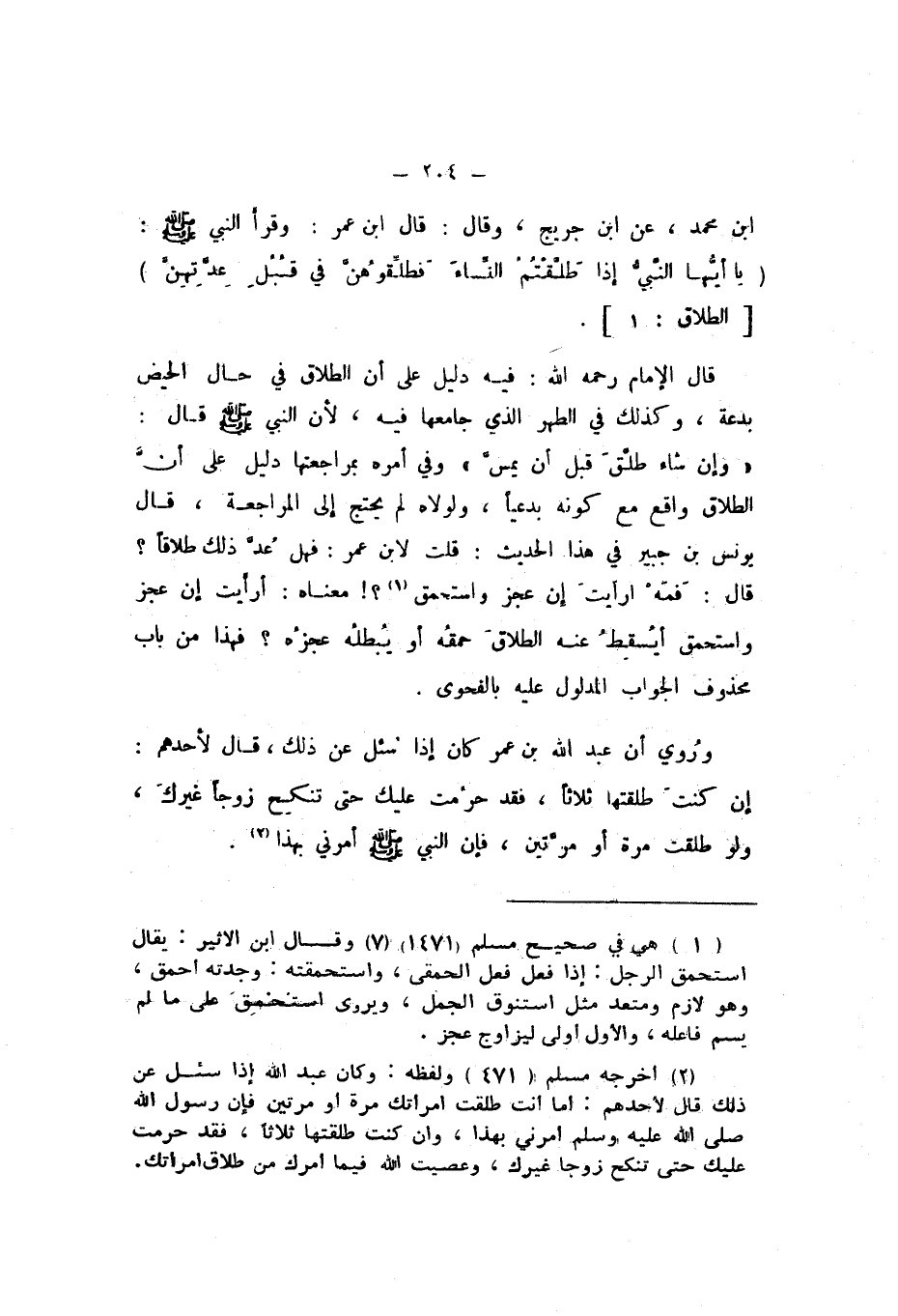 قَالَ الإِمَامُ رَحمَه اللَّه: فِيهِ دَلِيل على أَن الطَّلَاق فِي حَال الْحيض بِدعَة، وَكَذَلِكَ فِي الطُّهْر الَّذِي جَامعهَا فِيهِ، لِأَن النَّبِيّ صَلَّى اللهُ عَلَيْهِ وَسَلَّمَ قَالَ: «وَإِن شَاءَ طَلَّقَ قبل أَن يمسَّ»، وَفِي أمره بمراجعتها دَلِيل على أنَّ الطَّلَاق وَاقع مَعَ كَونه بدعيًا، ولولاه لم يحْتَج إِلَى الْمُرَاجَعَة، قَالَ يُونُس بْن جُبَير فِي هَذَا الْحَدِيث: قلت لِابْنِ عُمَر: فَهَل عُدَّ ذَلِكَ طَلَاقا؟، قَالَ: فَمَهْ أَرَأَيْتَ إِنْ عَجَزَ واسْتَحْمَقَ؟ مَعْنَاهُ: أَرَأَيْت إِن عجز واستحمق، أيُسقِطُ عَنْهُ الطَّلَاق حمقُه أَو يُبطله عجزُه؟ فهَذَا من بَاب مَحْذُوف الْجَواب الْمَدْلُول عَلَيْهِ بالفحوى.