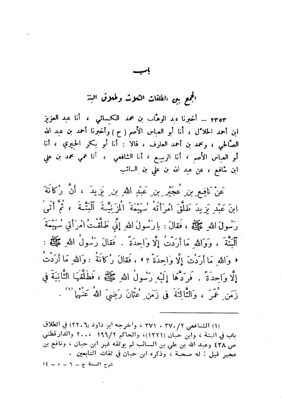 ح وَأَخْبَرَنَا أَحْمَدُ بْنُ عَبْدِ اللَّهِ الصَّالِحِيُّ، وَمُحَمَّدُ بْنُ أَحْمَدَ الْعَارِفُ، قَالا: أَنا أَبُو بَكْرٍ الْحِيرِيُّ، أَنا أَبُو الْعَبَّاسِ الأَصَمُّ، أَنا الرَّبِيعُ، أَنا الشَّافِعِيُّ، أَنا عَمِّي مُحَمَّدُ بْنُ عَلِيِّ بْنِ شَافِعٍ، عَنْ عَبْدِ اللَّهِ بْنِ عَلِيِّ بْنِ السَّائِبِ، عَنْ نَافِعِ بْنِ عُجَيْرِ بْنِ عَبْدِ اللَّهِ بْنِ يَزِيدَ، أَنَّ رُكَانَةَ بْنَ عَبْد يَزِيدَ طَلَّقَ امْرَأَتَهُ سُهَيْمَةَ الْمُزَنِيَّةَ الْبَتَّةَ، ثُمَّ أَتَى رَسُولَ اللَّهِ صَلَّى اللهُ عَلَيْهِ وَسَلَّمَ، فَقَالَ: يَا رَسُولَ اللَّهِ، إِنِّي طَلَّقْتُ امْرَأَتِي سُهَيْمَةَ البَتَّةَ، وَوَاللَّهِ مَا أَرَدْتُ إِلا وَاحِدَةً.