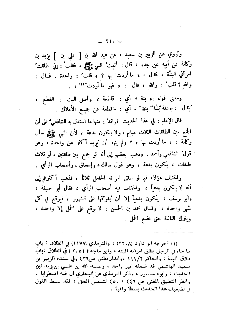 ورُوي عَنِ الزُّبَيْرِ بْنِ سَعِيدٍ، عَنْ عَبْدِ اللَّهِ بْنِ عَلِيِّ بْنِ يَزِيدَ بْنِ رُكَانَةَ، عَنْ أَبِيهِ، عَنْ جَدِّهِ، قَالَ: أَتَيْتُ النَّبِيَّ صَلَّى اللهُ عَلَيْهِ وَسَلَّمَ، فَقُلْتُ: إِنِّي طَلَّقْتُ امْرَأَتِي الْبَتَّةَ، فَقَالَ: «مَا أَرَدْتَ بِهَا؟»، قُلْتُ: وَاحِدَةً.