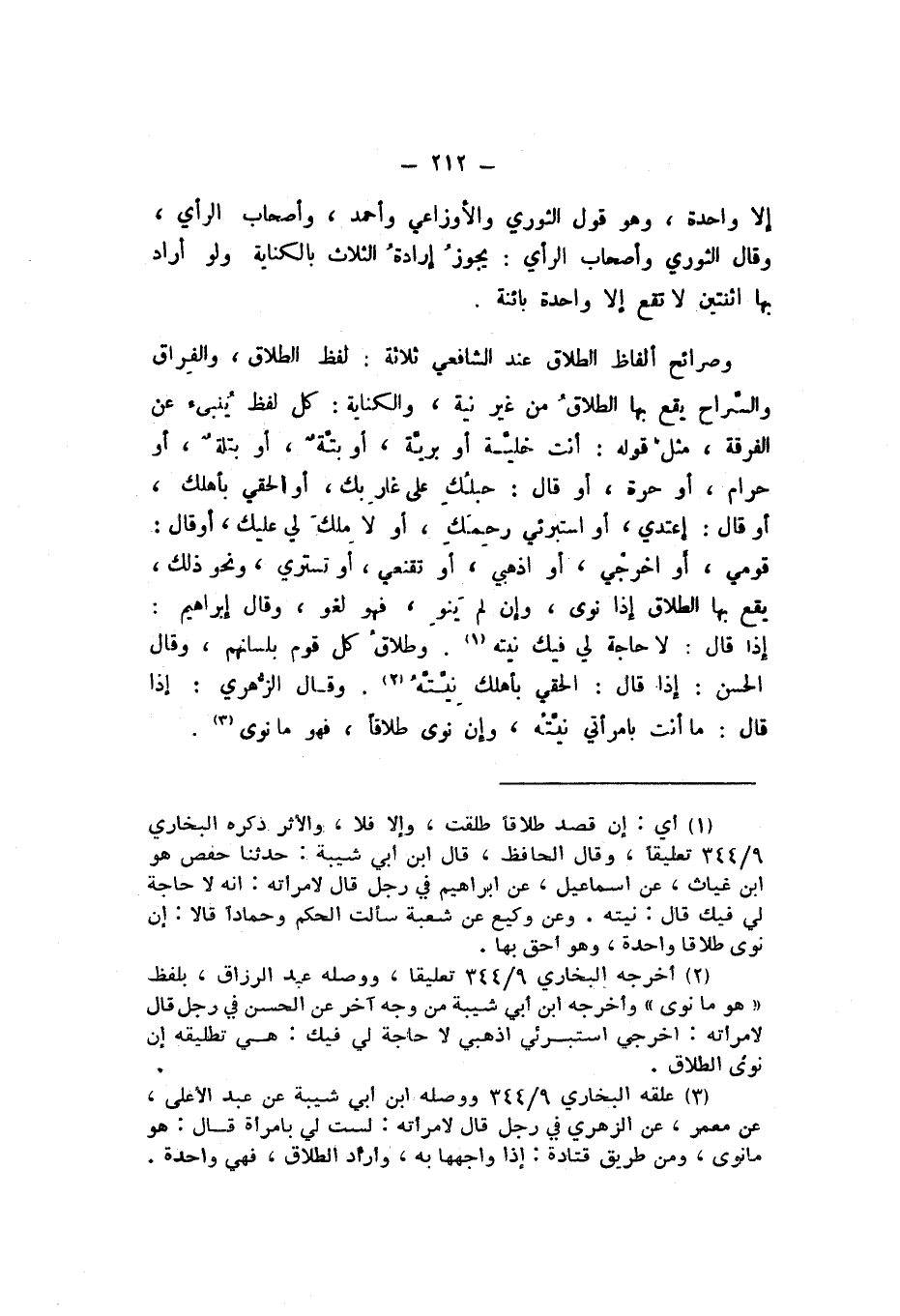 وصرائح أَلْفَاظ الطَّلَاق عِنْد الشَّافِعِيّ ثَلَاثَة: لفظ الطَّلَاق، والفِراق، والسَّراح، يَقع بهَا الطلاقُ من غير نِيَّة، وَالْكِنَايَة: كل لفظ يُنبئ عَنِ الْفرْقَة، مثل قَوْله: أَنْت خليَّة، أَو بريَّة، أَو بتَّةٌ أَو بتلةٌ، أَو حرَام، أَو حرَّة، أَو قَالَ: حبلُكِ على غارِبك، أَو ألحقي بأهلك، أَو قَالَ: اعْتدي، أَو استبرئي رَحِمك، أَو لَا ملكَ لي عَلَيْك، أَو قَالَ: قومِي، أَو اخْرُجِي، أَو اذهبي، أَو تقنعي، أَو تستري، وَنَحْو ذَلِكَ، يَقع بهَا الطَّلَاق إِذا نوى، وَإِن لم ينوِ، فَهُوَ لَغْو، وَقَالَ إِبْرَاهِيم: إِذا قَالَ: لَا حَاجَة لي فِيك نِيَّته، وطلاقُ كل قوم بلسانهم، وَقَالَ الْحَسَن: إِذا قَالَ: ألحقي بأهلك نيتهُ.