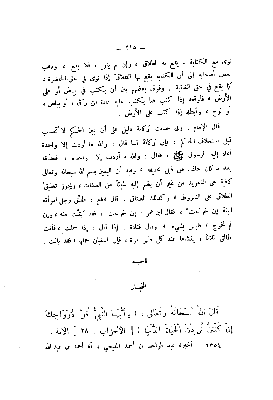 نوى مَعَ الْكِتَابَة، يَقع بِهِ الطَّلَاق، وَإِن لم ينْو، فَلَا يَقع، وَذهب بعض أَصْحَابه إِلَى أَن الْكِنَايَة يَقع بهَا الطَّلَاق إِذا نوى فِي حق الْحَاضِرَة، كَمَا يَقع فِي حق الغائبة، وَفرق بَعضهم بَين أَن يكْتب فِي بَيَاض أَو على الأَرْض، فأوقعه إِذا كتب فِيمَا يكْتب عَلَيْهِ عَادَة من رَق، أَو بَيَاض، أَو لوح، وأبطله إِذا كتب على الأَرْض.
