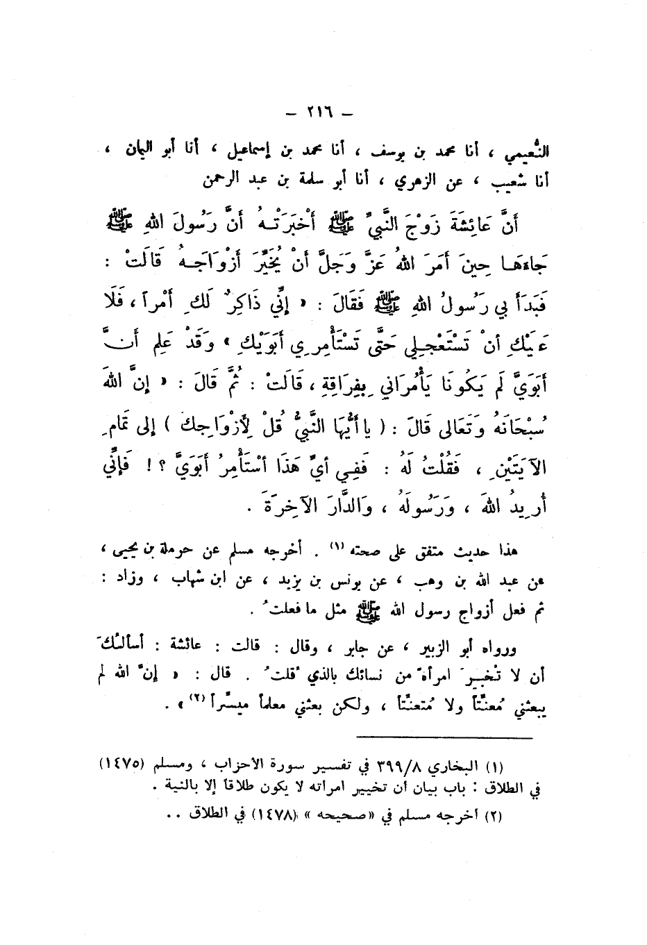 النُّعَيْمِيُّ، أَنا مُحَمَّدُ بْنُ يُوسُفَ، أَنا مُحَمَّد بْن إِسْمَاعِيل، أَنا أَبُو الْيَمَانِ، أَنا شُعَيْبٌ، عَنِ الزُّهْرِيِّ، أَنا أَبُو سَلَمَةَ بْنُ عَبْدِ الرَّحْمَنِ، أنَّ عَائِشَةَ، زَوْجَ النَّبِيِّ صَلَّى اللهُ عَلَيْهِ وَسَلَّمَ، أَخْبَرَتْهُ أَنَّ رَسُولَ اللَّهِ صَلَّى اللهُ عَلَيْهِ وَسَلَّمَ جَاءَهَا حِينَ أَمَرَ اللَّهُ عَزَّ وَجَلَّ أَنْ يُخَيِّرَ أَزْوَاجَهُ، قَالَتْ: فَبَدَأَ بِي رَسُولُ اللَّهِ صَلَّى اللهُ عَلَيْهِ وَسَلَّمَ، فَقَالَ: «إِنِّي ذَاكِرٌ لَكِ أَمْرًا، فَلا عَلَيْكِ أَنْ تَسْتَعْجِلِي حَتَّى تَسْتَأْمِرِي أَبَوَيْكِ»، وَقَدْ عَلِمَ أَنَّ أَبَوَيَّ لَمْ يَكُونَا يَأْمُرَانِي بِفِرَاقِهِ، قَالَتْ: ثُمَّ قَالَ: " إِنَّ اللَّهَ سُبْحَانَهُ وَتَعَالَى قَالَ: {يَأَيُّهَا النَّبِيُّ قُلْ لأَزْوَاجِكَ} [الْأَحْزَاب: 28] إِلَى تَمَامِ الآيَتَيْنِ، فَقُلْتُ لَهُ: فَفِي أَيِّ هَذَا أسْتأْمِرُ أَبَوَيَّ؟! فَإِنِّي أُرِيدُ اللَّهَ وَرَسُولَهُ، وَالدَّارَ الآخِرَةَ.