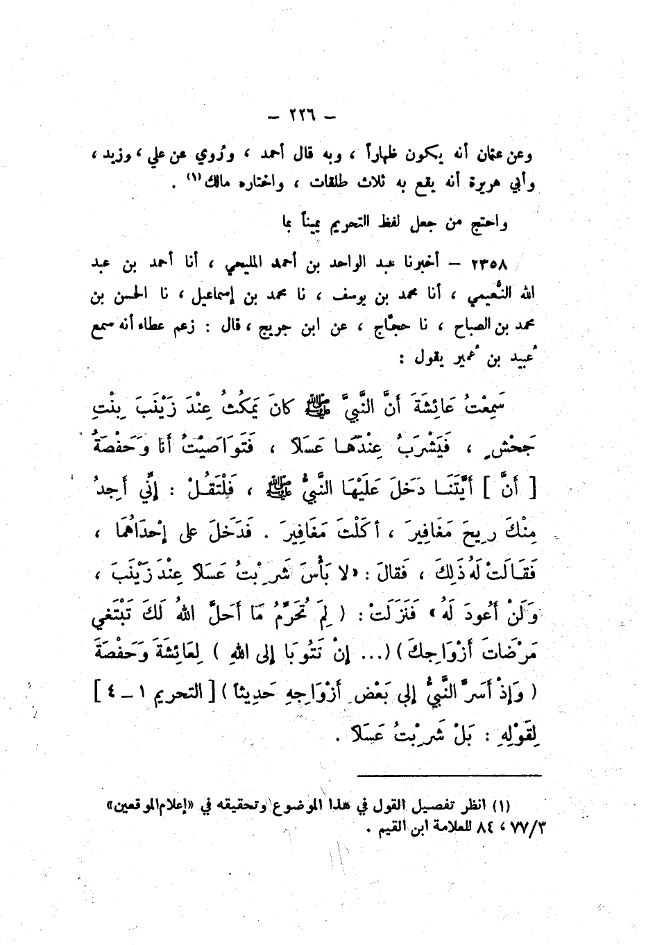 2358 - أَخْبَرَنَا عَبْدُ الْوَاحِدِ بْنُ أَحْمَدَ الْمَلِيحِيُّ، أَنا أَحْمَدُ بْنُ عَبْدِ اللَّهِ النُّعَيْمِيُّ، أَنا مُحَمَّدُ بْنُ يُوسُفَ، نَا مُحَمَّدُ بْنُ إِسْمَاعِيلَ، نَا الْحَسَنُ بْنُ مُحَمَّدِ بْنِ الصَّبَّاحِ، نَا حَجَّاجٌ، عَنِ ابْنِ جُرَيْجٍ، قَالَ: زَعَمَ عَطَاءٌ، أَنَّهُ سَمِعَ عُبَيْدَ بْنِ عُمَيْرٍ، يَقُولُ: سَمِعْتُ عَائِشَةَ أَنَّ النَّبِيَّ صَلَّى اللهُ عَلَيْهِ وَسَلَّمَ كَانَ يَمْكُثُ عِنْدَ زَيْنَبَ بِنْتِ جَحْشٍ، فَيَشْرَبُ عِنْدَهَا عَسَلا، فَتَوَاصَيْتُ أَنَا وَحَفْصَةُ أَنَّ أَيَّتَنَا دَخَلَ عَلَيْهَا النَّبِيُّ صَلَّى اللهُ عَلَيْهِ وَسَلَّمَ، فَلْتَقُلْ: إِنِّي أَجِدُ مِنْكَ رِيحَ مَغَافِيرَ، أَكَلْتَ مَغَافِيرَ.