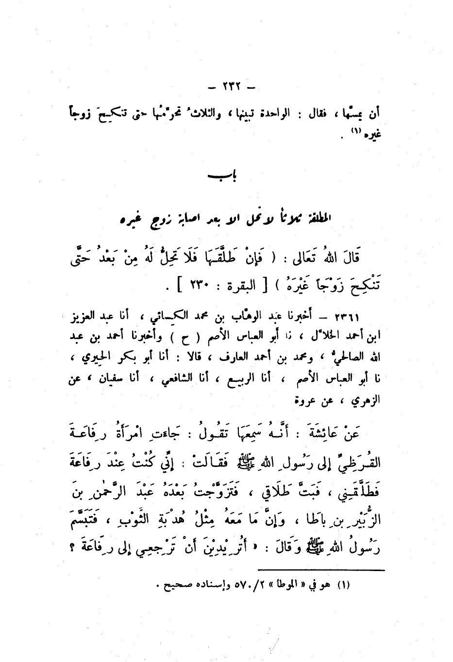 ح وَأَخْبَرَنَا أَحْمَدُ بْنُ عَبْدِ اللَّهِ الصَّالِحِيُّ، وَمُحَمَّدُ بْنُ أَحْمَدَ الْعَارِفُ، قَالا: أَنا أَبُو بَكْرٍ الْحِيرِيُّ، نَا أَبُو الْعَبَّاسِ الأَصَمُّ، أَنا الرَّبِيعُ، أَنا الشَّافِعِيُّ، أَنا سُفْيَان، عَنِ الزُّهْرِيِّ، عَنْ عُرْوَةَ، عَنْ عَائِشَةَ، أَنَّهُ سَمِعَهَا تَقُولُ: جَاءَتِ امْرَأَةُ رِفَاعَةَ الْقُرَظِيِّ إِلَى رَسُولِ اللَّهِ صَلَّى اللهُ عَلَيْهِ وَسَلَّمَ، فَقَالَتْ: إنِّي كُنْتُ عِنْدَ رِفَاعَةَ فَطَلَّقَنِي، فَبَتَّ طَلاقِي، فَتَزَوَّجْتُ بَعْدَهُ عَبْدَ الرَّحْمَنِ بْنَ الزُّبَيْرِ بْنِ بَاطَا، وَإِنَّ مَا مَعَهُ مِثْلُ هُدْبَةِ الثَّوْبِ، فَتَبَسَّمَ رَسُولُ اللَّهِ صَلَّى اللهُ عَلَيْهِ وَسَلَّمَ، وَقَالَ: «أَتُرِيدِينَ أَنْ تَرْجِعِي إِلَى رِفَاعَةَ؟