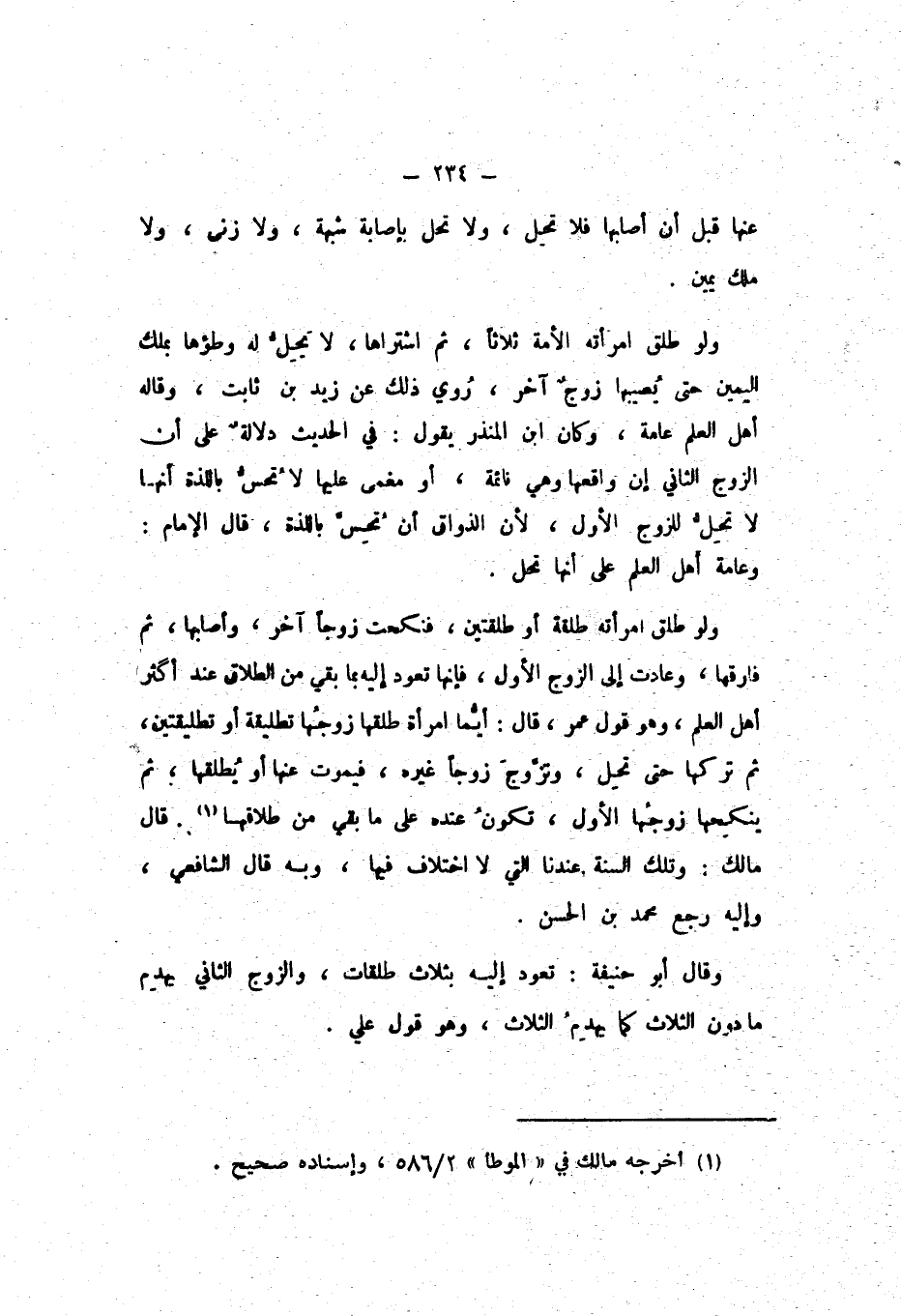 وَلَو طلق امْرَأَته طَلْقَة أَو طَلْقَتَيْنِ، فنكحت زوجا آخر، وأصابها، ثُمَّ فَارقهَا، وعادت إِلَى الزَّوْج الأول، فَإِنَّهَا تعود إِلَيْهِ بِمَا بَقِي من الطَّلَاق عِنْد أَكثر أهل الْعلم، وَهُوَ قَول عُمَر، قَالَ: «أَيُّمَا امَرْأةٍ طَلَّقَهَا زَوْجُها تَطْلِيقةً أَوْ تَطَلِيقَتيْن، ثُمَّ تَركَهَا حَتَّى تَحِلَّ، وتزوَّج زَوْجًا غَيْرهُ، فَيَمُوتُ عَنها أَو يُطَلِّقُها، ثُمَّ يَنْكِحُها زَوْجُها الأَوَّلُ، تَكُونُ عِنْدَهُ على مَا بقيَ مِنْ طَلاقِهَا».