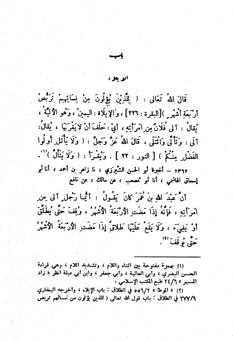 2362 - أَخْبَرَنَا أَبُو الْحَسَنِ الشِّيرَزِيُّ، نَا زَاهِرُ بْنُ أَحْمَدَ، أَنا أَبُو إِسْحَاقَ الْهَاشِمِيُّ، أَنا أَبُو مُصْعَبٍ، عَنْ مَالِكٍ، عَنْ نَافِعٍ، أَنَّ عَبْدَ اللَّهِ بْنَ عُمَرَ كَانَ يَقُولُ: «أَيُّمَا رَجُلٍ آلَى مِنَ امْرَأَتِهِ، فَإِنَّهُ إِذَا مَضَتِ الأَرْبَعَةُ الأَشْهُرِ، وُقِفَ حتَّى يُطَلِّقَ أَوْ يَفِيءَ، وَلا يَقَعُ عَلَيْهَا طَلاقٌ إِذَا مَضَتِ الأَرْبَعَةُ الأَشْهُرِ حتَّى يُوقَفَ».