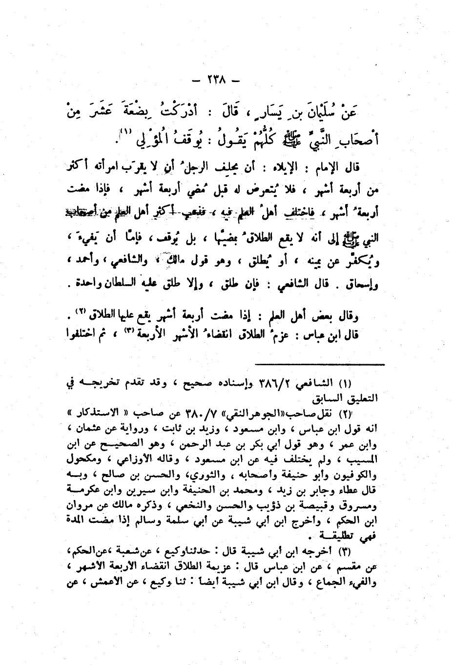 قَالَ الإِمَامُ: الْإِيلَاء: أَن يحلف الرجلُ أَن لَا يقربَ امْرَأَته أَكثر من أَرْبَعَة أشهر، فَلَا يُتعرض لَهُ قبل مُضي أَرْبَعَة أشهر، فَإِذا مَضَت أربعةُ أشهر، فَاخْتلف أهلُ الْعلم فِيهِ، فَذهب أَكثر أهل الْعلم من أَصْحَاب النَّبِيّ صَلَّى اللهُ عَلَيْهِ وَسَلَّمَ إِلَى أَنَّهُ لَا يَقع الطلاقُ بمضيِّها، بل يُوقف، فإمَّا أَن يَفيءَ، ويُكفِّر عَنْ يَمِينه، أَو يُطلق، وَهُوَ قَول مَالِك، وَالشَّافِعِيّ، وَأَحْمَد، وَإِسْحَاق.