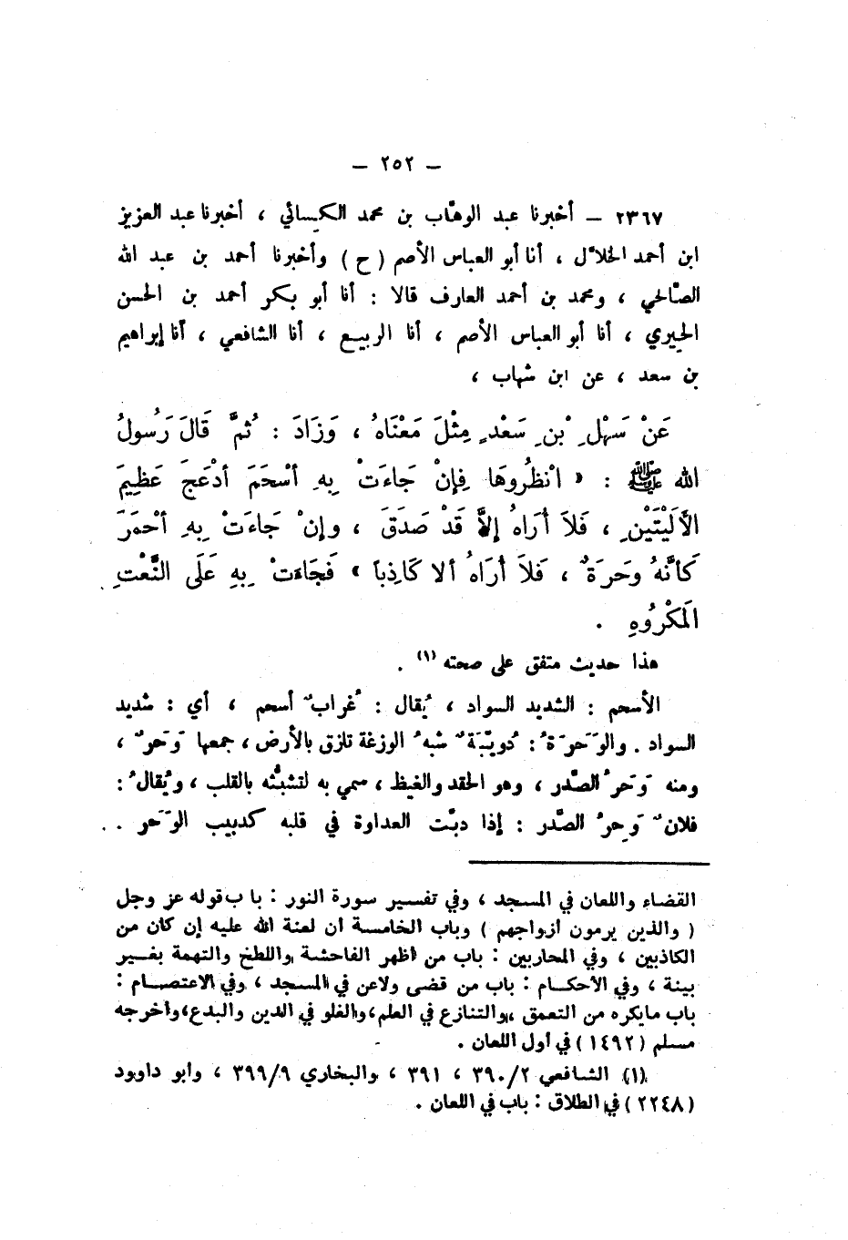 ح وَأَخْبَرَنَا أَحْمَدُ بْنُ عَبْدِ اللَّهِ الصَّالِحِيُّ، وَمُحَمَّدُ بْنُ أَحْمَدَ الْعَارِفُ، قَالا: أَنا أَبُو بَكْرٍ أَحْمَدُ بْنُ الْحَسَنِ الْحِيرِيُّ، أَنا أَبُو الْعَبَّاسِ الأَصَمُّ، أَنا الرَّبِيعُ، أَنا الشَّافِعِيُّ، أَنا إِبْرَاهِيمُ بْنُ سَعْدٍ، عَنِ ابْنِ شِهَابٍ، عَنْ سَهْلِ بْنِ سَعْدٍ، مِثْلَ مَعْنَاهُ، وَزَادَ: ثُمَّ قَالَ رَسُولُ اللَّهِ صَلَّى اللهُ عَلَيْهِ وَسَلَّمَ: «انْظُرُوهَا فَإِنْ جَاءَتْ بِهِ أَسْحَمَ أَدْعَجَ عَظِيمَ الأَلْيَتَيْنِ، فَلا أُرَاهُ إِلا قَدْ صَدَقَ، وَإِنْ جَاءَتْ بِهِ أَحْمَرَ كَأَنَّهُ وَحَرَةٌ، فَلا أُرَاهُ إِلا كَاذِبًا»، فَجَاءَتْ بِهِ عَلَى النَّعْتِ الْمَكْرُوهِ.
