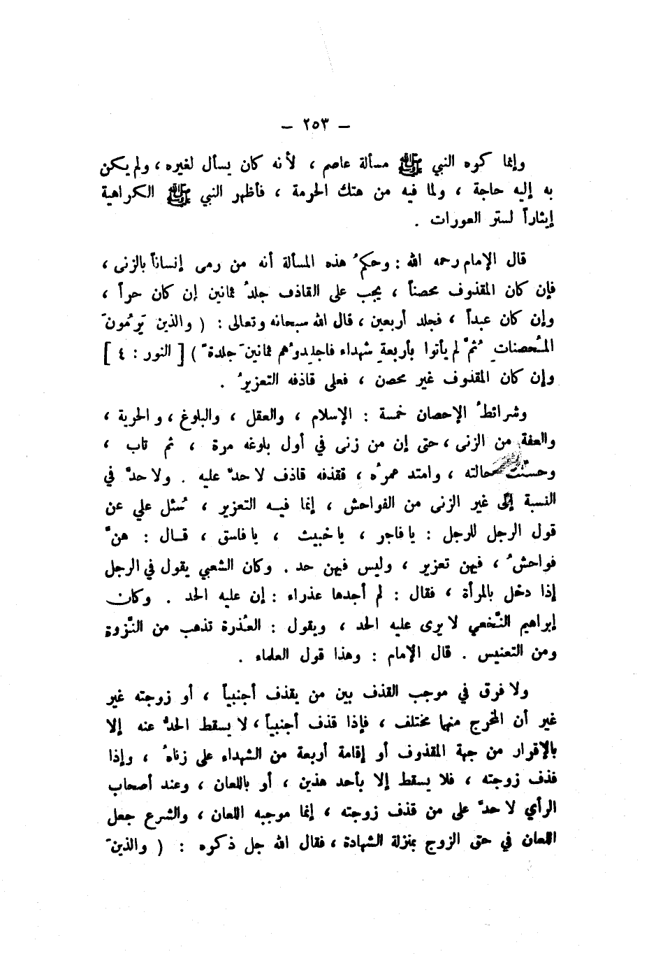 قَالَ الإِمَامُ رَحمَه اللَّه: وحكمُ هَذَا الْمَسْأَلَة أَنَّهُ من رمى إنْسَانا بالزنى، فَإِن كَانَ الْمَقْذُوف مُحصنا، يجب على الْقَاذِف جلدُ ثَمَانِينَ إِن كَانَ حرا، وَإِن كَانَ عبدا، فجلد أَرْبَعِينَ، قَالَ اللَّه سُبْحَانَهُ وَتَعَالَى: {وَالَّذِينَ يَرْمُونَ الْمُحْصَنَاتِ ثُمَّ لَمْ يَأْتُوا بِأَرْبَعَةِ شُهَدَاءَ فَاجْلِدُوهُمْ ثَمَانِينَ جَلْدَةً} [النُّور: 4]، وَإِن كَانَ الْمَقْذُوف غير مُحصن، فعلى قَاذفه التَّعْزِير.