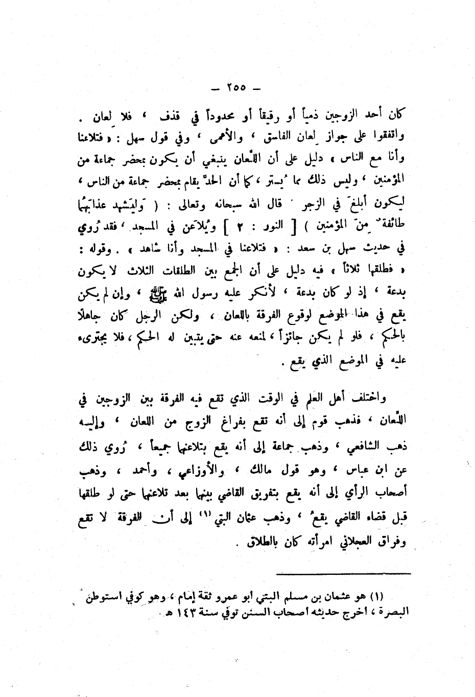 وَقَوله: «فَطَلَّقَهَا ثَلاثًا» فِيهِ دَلِيل على أَن الْجمع بَين الطلقات الثَّلَاث لَا يكون بِدعَة، إِذْ لَو كَانَ بِدعَة، لأنكر عَلَيْهِ رَسُولُ اللَّه صَلَّى اللهُ عَلَيْهِ وَسَلَّمَ، وَإِن لم يكن يَقع فِي هَذَا الْموضع لوُقُوع الْفرْقَة بِاللّعانِ، وَلَكِن الرجل كَانَ جَاهِلا بالحكم، فَلَو لم يكن جَائِزا، لمَنعه عَنْهُ حَتَّى يتَبَيَّن لَهُ الحكم، فَلَا يجترئ عَلَيْهِ فِي الْموضع الَّذِي يَقع.