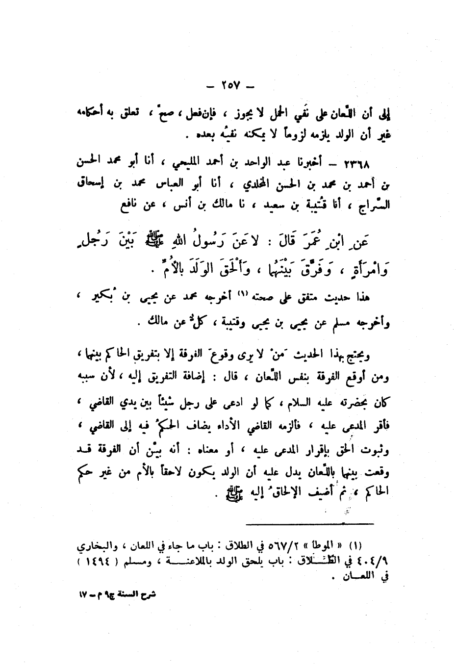 2368 - أَخْبَرَنَا عَبْدُ الْوَاحِدِ بْنُ أَحْمَدَ الْمَلِيحِيُّ، أَنا أَبُو مُحَمَّدٍ الْحَسَنُ بْنُ أَحْمَدَ بْنِ مُحَمَّدِ بْنِ الْحَسَنِ الْمَخْلَدِيُّ، أَنا أَبُو الْعَبَّاسِ مُحَمَّدُ بْنُ إِسْحَاقَ السَّرَّاجُ، أَنا قُتَيْبَةُ بْنُ سَعِيدٍ، نَا مَالِكُ بْنُ أَنَسٍ، عَنْ نَافِعٍ، عَنِ ابْنِ عُمَرَ، قَالَ: «لاعَنَ رَسُولُ اللَّهِ صَلَّى اللهُ عَلَيْهِ وَسَلَّمَ بَيْنَ رَجُلٍ وَامْرَأَةٍ، وَفَرَّقَ بَيْنَهُمَا، وَأَلْحَقَ الْوَلَدَ بِالأُمِّ».