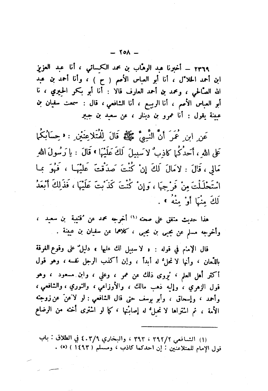 ح وَأَنا أَحْمَدُ بْنُ عَبْدِ اللَّهِ الصَّالِحِيُّ، وَمُحَمَّدُ بْنُ أَحْمَدَ الْعَارِفُ، قَالا: أَنا أَبُو بَكْرٍ الْحِيرِيُّ، نَا أَبُو الْعَبَّاسِ الأَصَمُّ، أَنا الرَّبِيعُ، أَنا الشَّافِعِيُّ، قَالَ: سَمِعْتُ سُفْيَانَ بْنَ عُيَيْنَةَ، يَقُولُ: أَنا عَمْرُو بْنُ دِينَارٍ، عَنْ سَعِيدِ بْنِ جُبَيْرٍ، عنِ ابْنِ عُمَرَ، أَنّ النَّبِيَّ صَلَّى اللهُ عَلَيْهِ وَسَلَّمَ قَالَ لِلْمُتَلاعِنَيْنِ: «حِسَابُكُمَا عَلَى اللَّهِ، أَحَدُكُمَا كَاذِبٌ لَا سَبِيلَ لَكَ عَلَيْهَا».